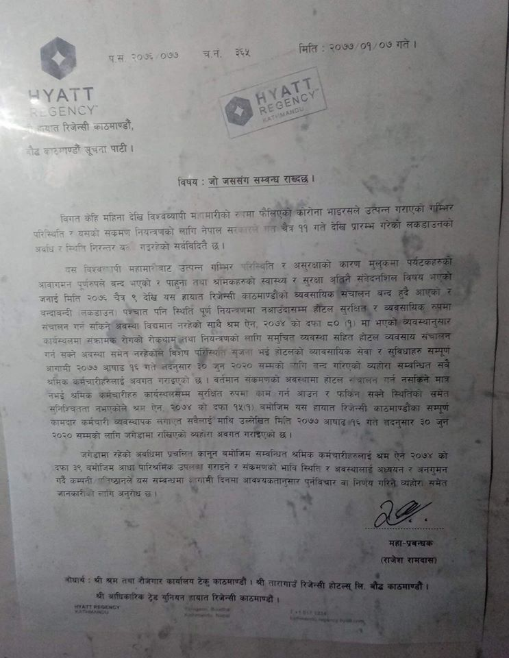 होटलले आइतबार सूचना निकाली कोरोना भाइरस संक्रमणको जोखिमका कारण हा्टल बन्द गर्नुपरेको जनाएको हो ।