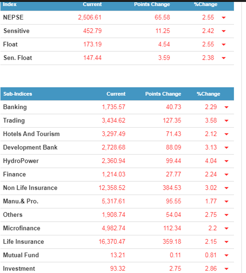काठमाडौं, वैशाख १३ – सोमबार पनि शेयर बजारमा ठूलै पहिरो गयो । यसदिन ६५.५८ अंकले घटेर नेप्से परिसूचक २५०६.६१ विन्दुमा झरेको छ । यो गिरावट २.५५ प्रतिशत हो ।
