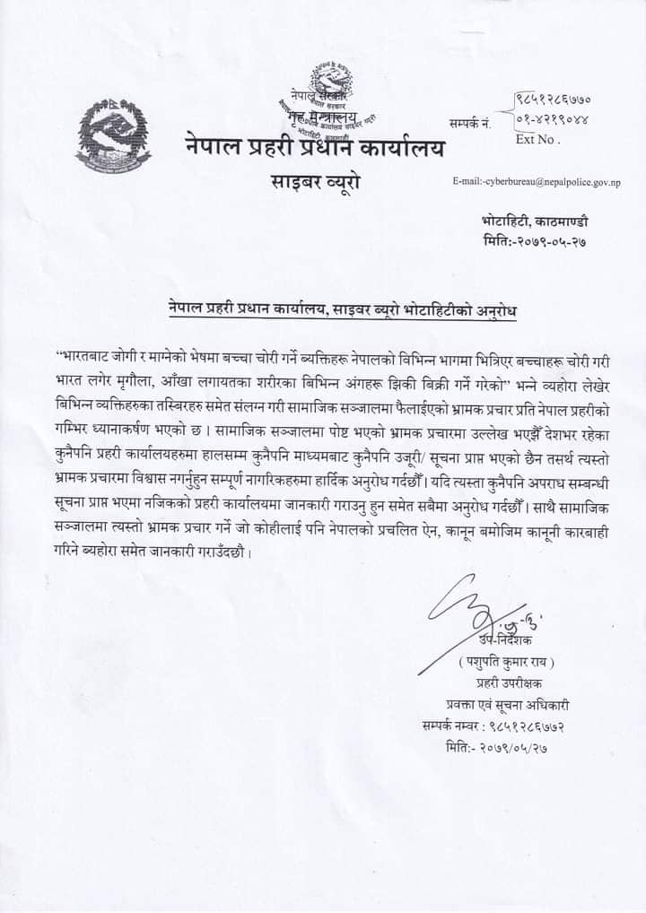 पछिल्लो समय विभिन्न व्यक्तिले सामाजिक सञ्जालमा भारतबाट आएकाहरूले नेपालमा बच्चा चोरी गरिरहेको भन्दै भ्रम फैलाएपछि प्रधान कार्यालय, साइवर ब्यूरो भोटाहिटीले एक सूचना जारी गर्दै त्यस्ता भ्रामक हल्लाको पछि नलाग्न आग्रह गरेको छ । त्यस्ता घटनाबारे अहिलेसम्म उजुरी प्राप्त नभएको प्रहरीले जनाएको छ ।