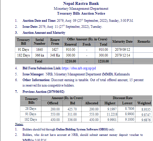राष्ट्र बैंकले ९१ दिन र १८२ दिनको लागि ट्रेजरी बिल जारी गर्न लागेको हो । मंगलबार जारी हुने यस ट्रेजरी बिलका लागि आज दिउँसो ३ बजे बोलकबोल हुनेछ । केन्द्रीय बैंकले ९१ दिनको लागि ९ अर्ब १० करोड रुपैयाँको ट्रेजरी जारी गर्न लागेको हो । यो ट्रेजरी पुस १२ गते परिपक्व हुनेछ । १८२ दिनका लागि ३ अर्ब रुपैयाँ बराबरको ट्रेजरी बिल जारी गर्न लागेको हो । यो ट्रेजरी चैत १४ गते परिपक्व हुनेछ ।