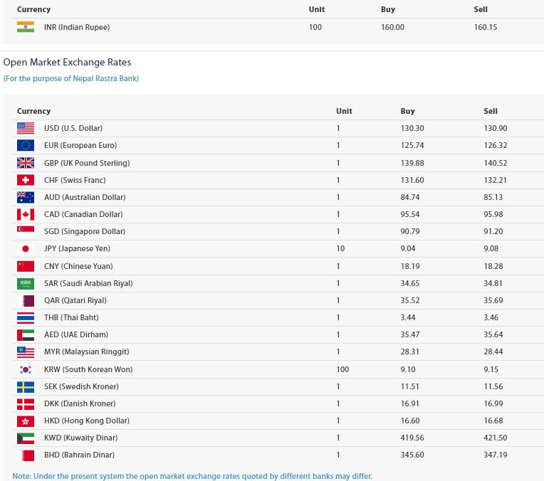 नेपाल राष्ट्र बैङ्कका अनुसार आज अमेरिकी डलर एकको खरिदमूल्य १३० रुपैयाँ ३० पैसा र बिक्रीमूल्य १३० रुपैयाँ ९० पैसा रहेको छ ।