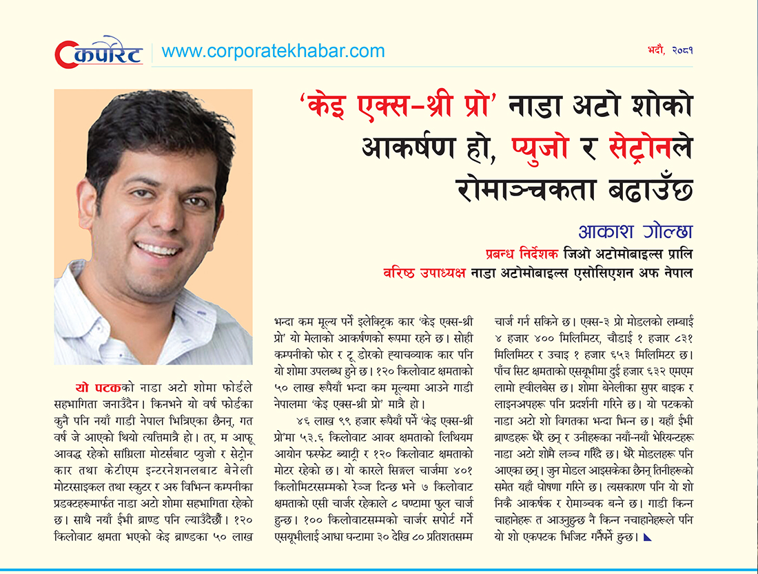साथै नयाँ ईभी ब्राण्ड पनि ल्याउँदैछौँ । १२० किलोवाट क्षमता भएको केइ ब्राण्डका ५० लाख भन्दा कम मूल्य पर्ने इलेक्ट्रिक कार ‘केइ एक्स–थ्री प्रो’ यो मेलाको आकर्षणको रूपमा रहने छ । सोही कम्पनीको फोर र टू डोरको ह्याचव्याक कार पनि यो शोमा उपलब्ध हुने छ । १२० किलोवाट क्षमताको ५० लाख रूपैयाँ भन्दा कम मूल्यमा आउने गाडी नेपालमा ‘केइ एक्स–थ्री प्रो’ मात्रै हो ।