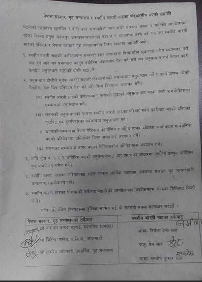 मंगलबार राति गृह मन्त्रालयमा सहमति भएको हो । सहमतिमा आरतीका परिवारको तर्फबाट उनकी आमा निर्मला देवी शाह, दाजु प्रेम शाह र मामा सन्तोष कुमार शाहले हस्ताक्षर गरेका छन् भने गृह मन्त्रालयको तर्फबाट सहसचिव नारायण प्रसाद भट्टराई, काठमाडौंका प्रजिअ जितेन्द्र बस्नेत र उपसचिव एकदेव अधिकारीले हस्ताक्षर गरेका छन् ।