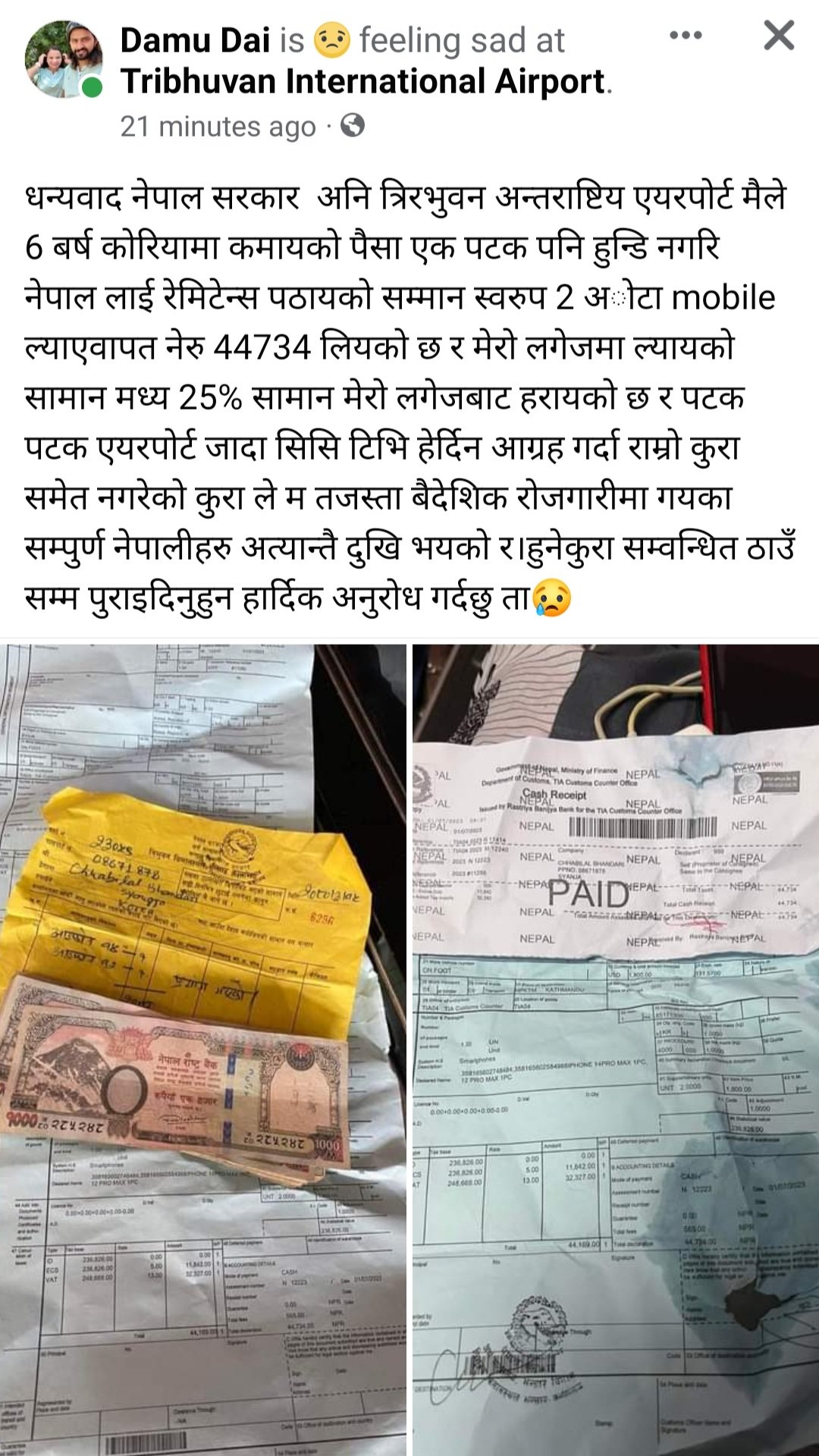 ‘दामु दाइ’ नामको ट्विटर ह्यान्डलमा पैसा तथा कागजातसहित लेखिएको छ, ‘धन्यवाद नेपाल सरकार अनि त्रिभुवन अन्तर्राष्ट्रिय एयरपोर्ट! मैले ६ वर्ष कोरियामा कमाएको पैसा एकपटक पनि हुन्डी नगरी नेपाललाई रेमिट्यान्स पठाएको सम्मानस्वरूप २ ओटा मोबाइल ल्याएबापत नेरु ४४७३४ लिएको छ र मेरो लगेजमा ल्याएको सामानमध्ये २५ प्रतिशत सामान मेरो लगेजबाट हराएको छ र पटकपटक एयरपोर्ट जाँदा सीसी टीभी हेर्दिन आग्रह गर्दा राम्रो कुरासमेत नगरेको कुराले मजस्ता वैदेशिक रोजगारीमा गएका सम्पूर्ण नेपालीहरू अत्यन्तै दुःखी भएको र हुने कुरा सम्बन्धित ठाउँसम्म पुर्याइदिनु हुन हार्दिक अनुरोध गर्दछु ।’