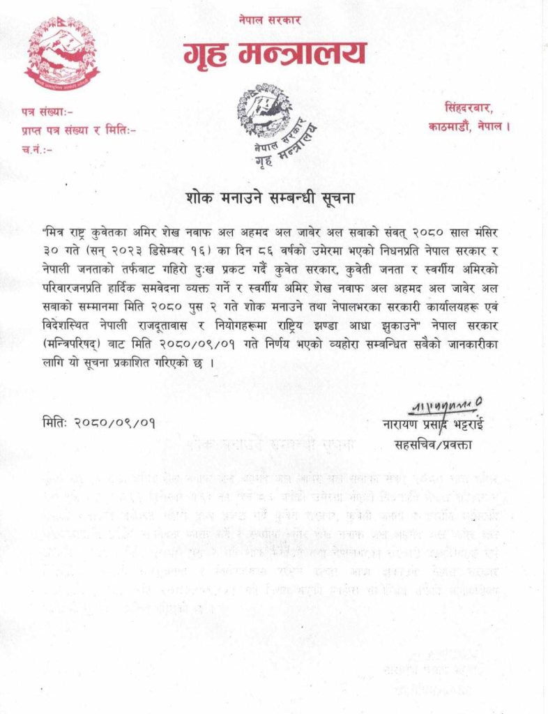 कुवेतका अमिर शेख नवाफ अल अहमद अल जावेर अल सबाको सम्मानमा सोमबार शोक मनाउने गृह मन्त्रालयले जनाएको छ ।
