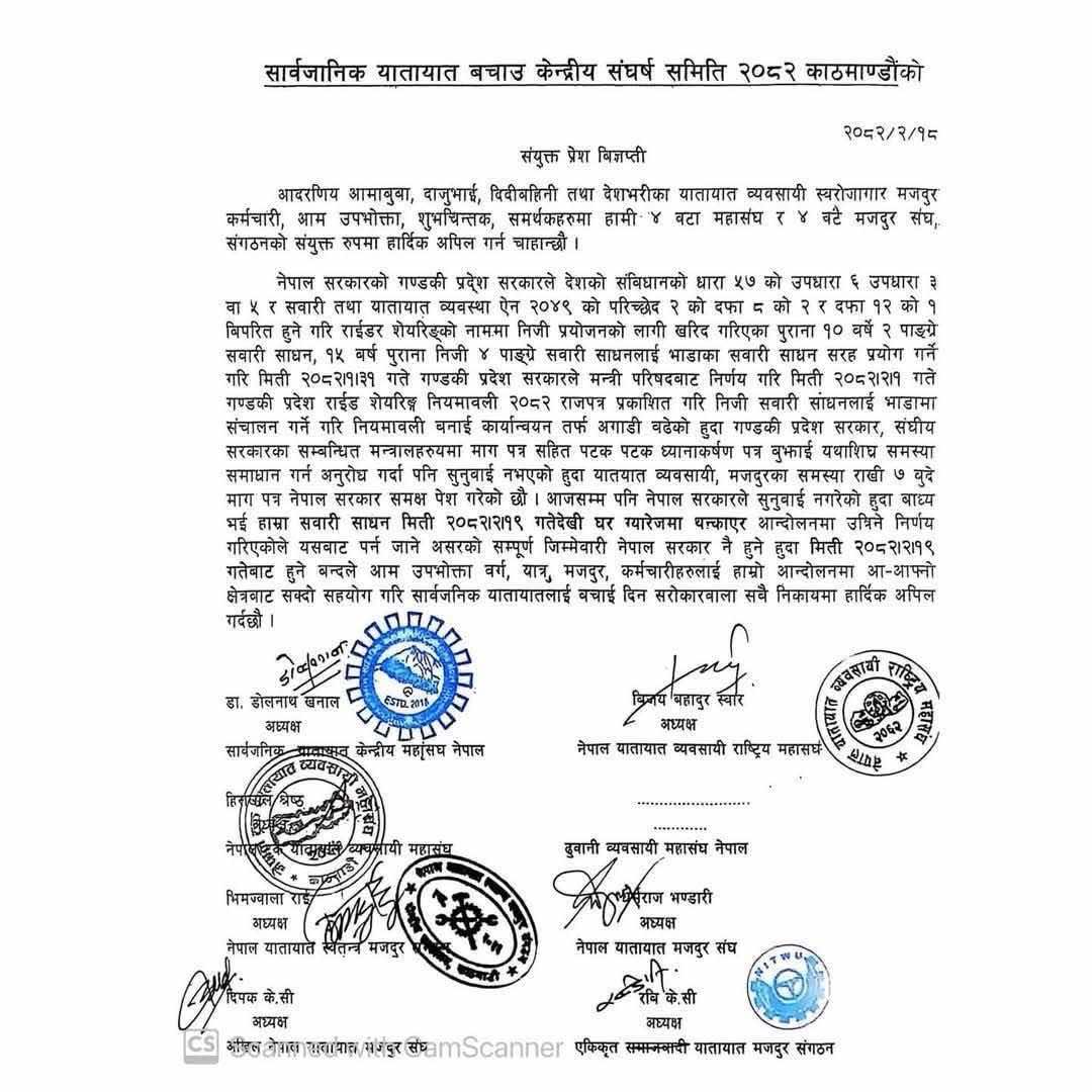 गण्डकी प्रदेश सरकारले नियमावली नै जारी गरेर ‘राइड सेयरिङ’का नाममा निजी सवारीसाधनलाई पनि यात्रु ओसारपसारमा प्रयोग गर्न दिएकामा आपत्ति जनाएका छन् ।