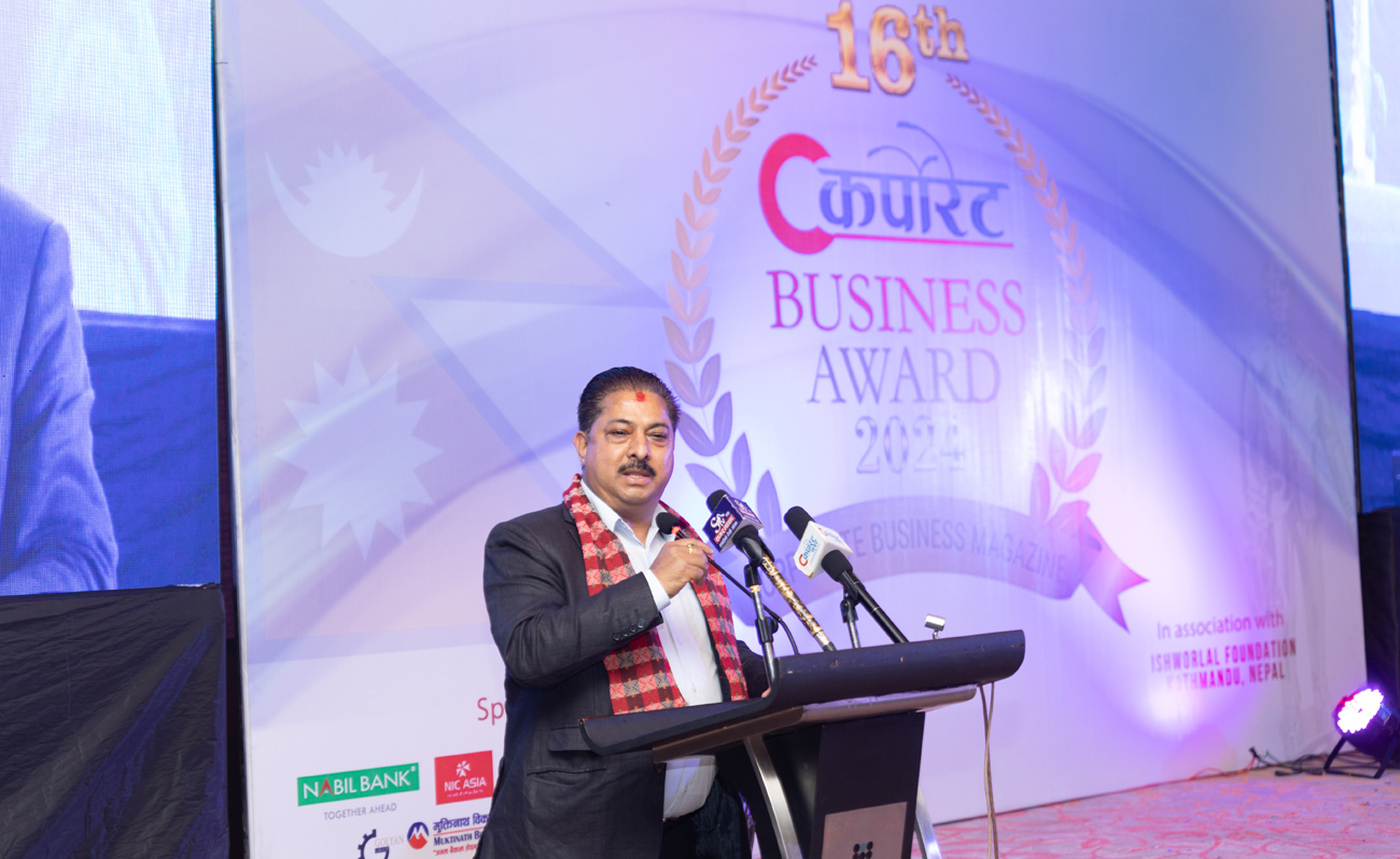 हिजो आइतबार साँझ होटेल ह्यात प्लेसमा कर्पोरेट मिडिया ग्रुपले आयोजना गरेको १६औँ संस्करणको ‘कर्पोरेट बिजनेस अवार्ड, २०८०’ लाई सम्बोधन गर्दै उनले राज्यले व्यवसायीका कुरा सुन्ने भन्दा बढी थुन्ने रणनीति लिएर प्रताडित बनाइरहेको बेलामा कर्पोरेट अवार्डले थोरै भए पनि ‘सञ्जीवनी’को काम गर्ने बताएका हुन् ।