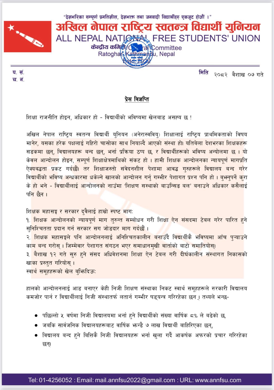 यस्तै, देशभरका शिक्षकहरू सडकमा अउाँदा विद्यालयहरू बन्द भएको, भर्ना प्रक्रिया ठप्प भएको र विद्यार्थीहरूको भविष्य अन्योलमा परेको भन्दै यो केवल आन्दोलन मात्र नभइ सम्पूर्ण शिक्षा क्षेत्रमाथिको सङ्कट भएको अनेरास्ववियुको ठहर छ ।
