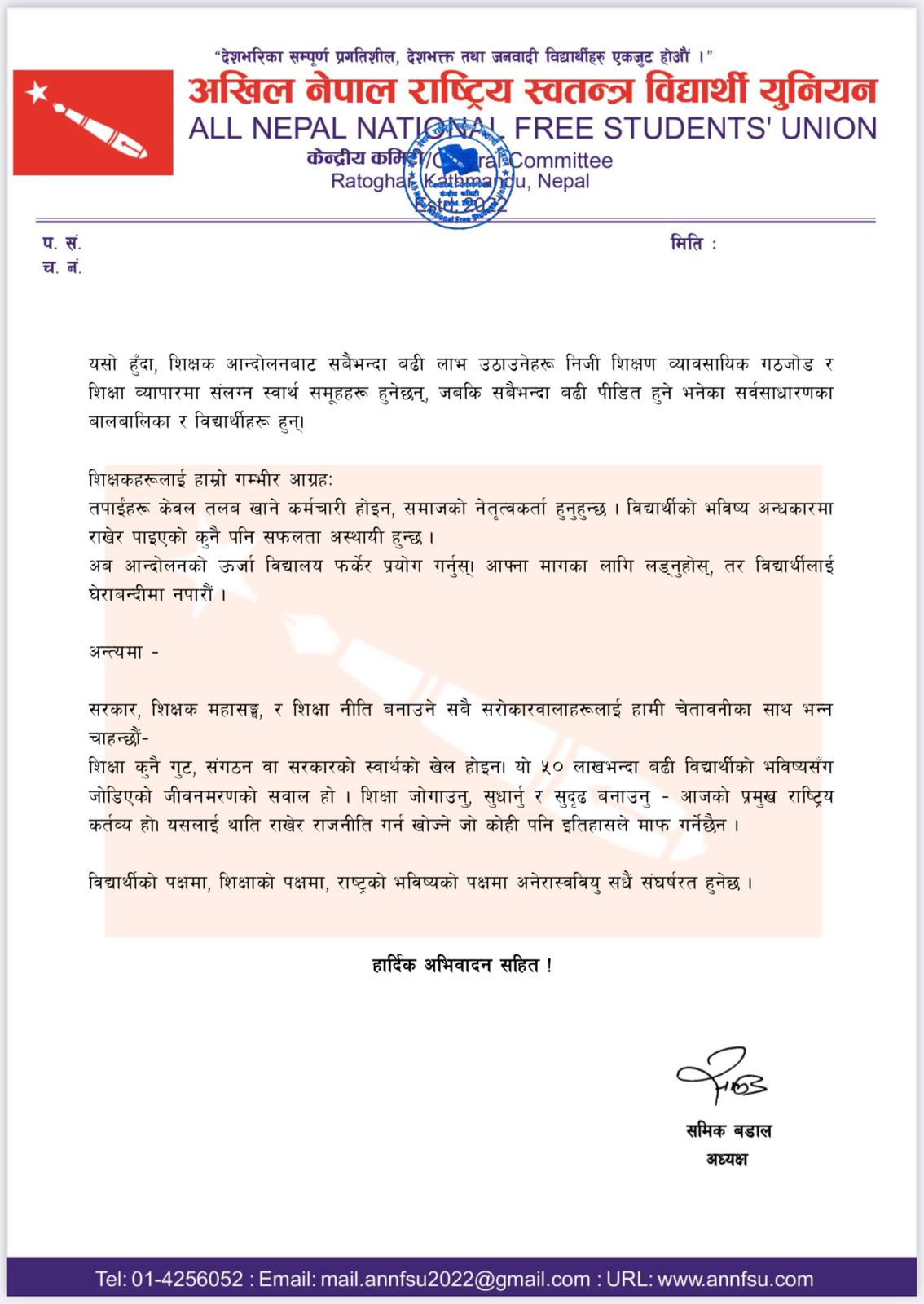 यसैगरी उसले शिक्षक आन्दोलनको न्यायपूर्ण माग तुरुन्त सम्बोधन गरी शिक्षा ऐन संसदमा टेबल गरेर पारित हुने सुनिश्चितता प्रदान गर्न सरकारसँग जोडदार माग गरेको छ भने शिक्षक महासंघले पनि आन्दोलनलाई अनिश्चितकालीन बनाउँदै विद्यार्थीकै भविष्यमा आँच पुर्याउने काम बन्द गर्न आग्रह गरेको छ । जिम्मेवार पेशागत सङ्गठनले समाधानमुखी वार्ताको बाटो समात्नुपर्नेमा अनेरास्ववियुको जोड छ ।