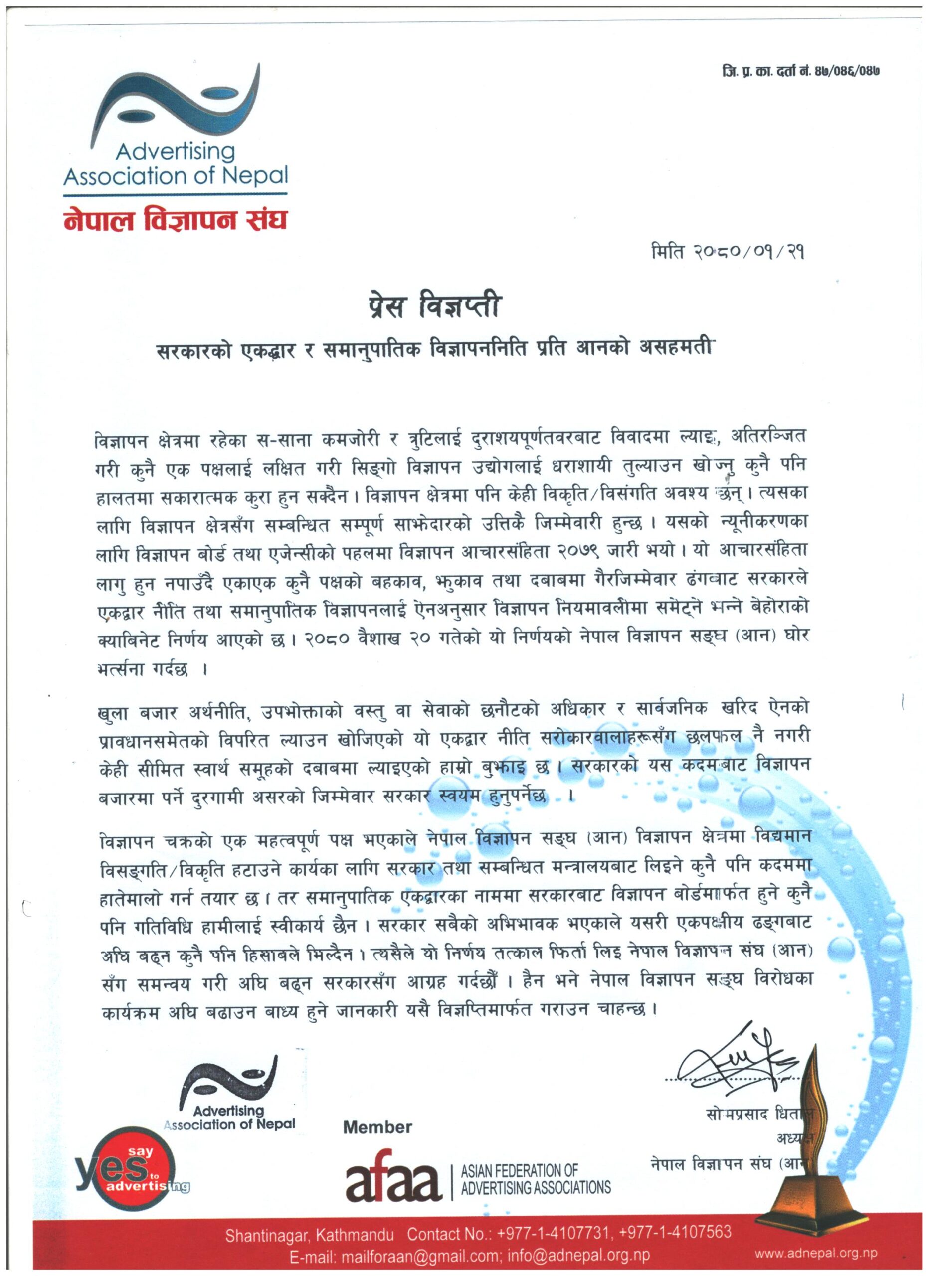 ‘तर समानुपातिक एकद्वारका नाममा सरकारबाट विज्ञापन बोर्डमार्फत हुने कुनै पनि गतिविधि हामीलाई स्वीकार्य छैन। सरकार सबैको अभिभावक भएकाले यसरी एकपक्षीय ढङ्गबाट अघि बढ्न कुनै पनि हिसाबले मिल्दैन’, विज्ञप्तिमा भनिएको छ, ‘त्यसैले यो निर्णय तत्काल फिर्ता लिइ नेपाल विज्ञापन संघ (आन) सँग समन्वय गरी अघि बढ्न सरकारसँग आग्रह गर्दछौँ। हैन भने नेपाल विज्ञापन सङ्घ विरोधका कार्यक्रम अघि बढाउन बाध्य हुने जानकारी यसै विज्ञप्तिमार्फत गराउन चाहन्छ।’