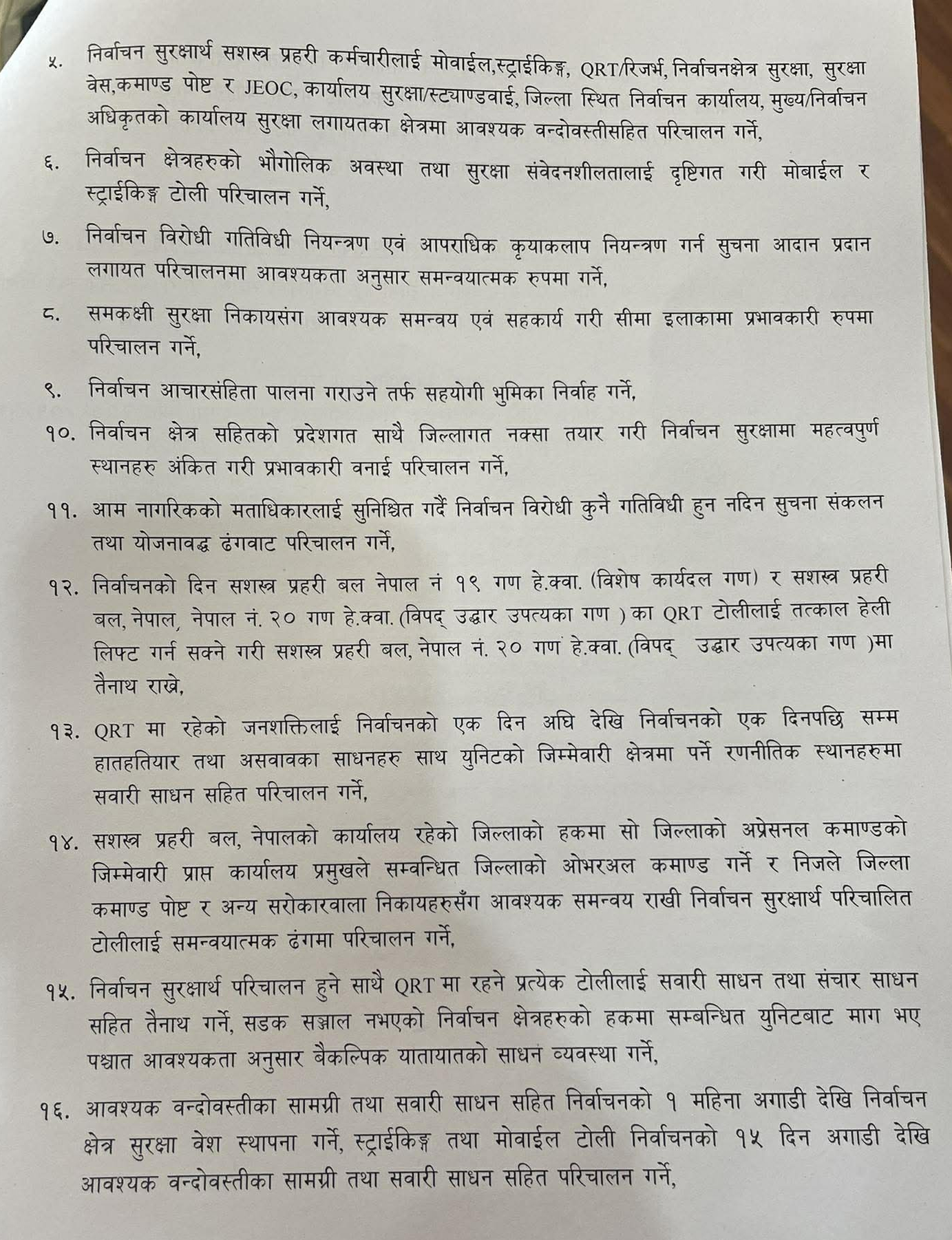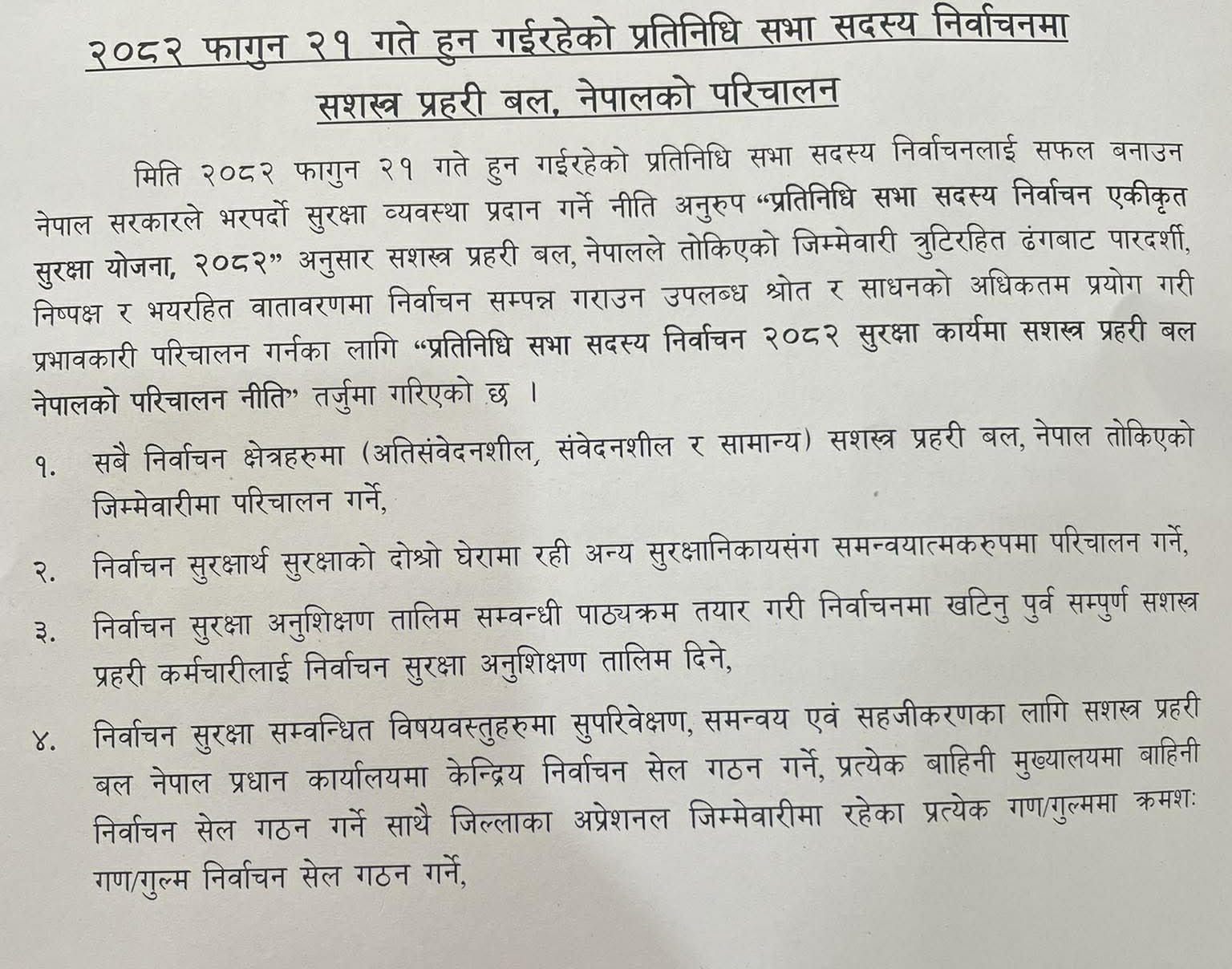 निर्वाचनको एक महिनाअघि नै निर्वाचन क्षेत्र सुरक्षा वेश स्थापना गर्ने र स्ट्राइकिङ्ग तथा मोबाइल टोली १५ दिन अगाडिदेखि परिचालन गरिने नीतिमा उल्लेख ५