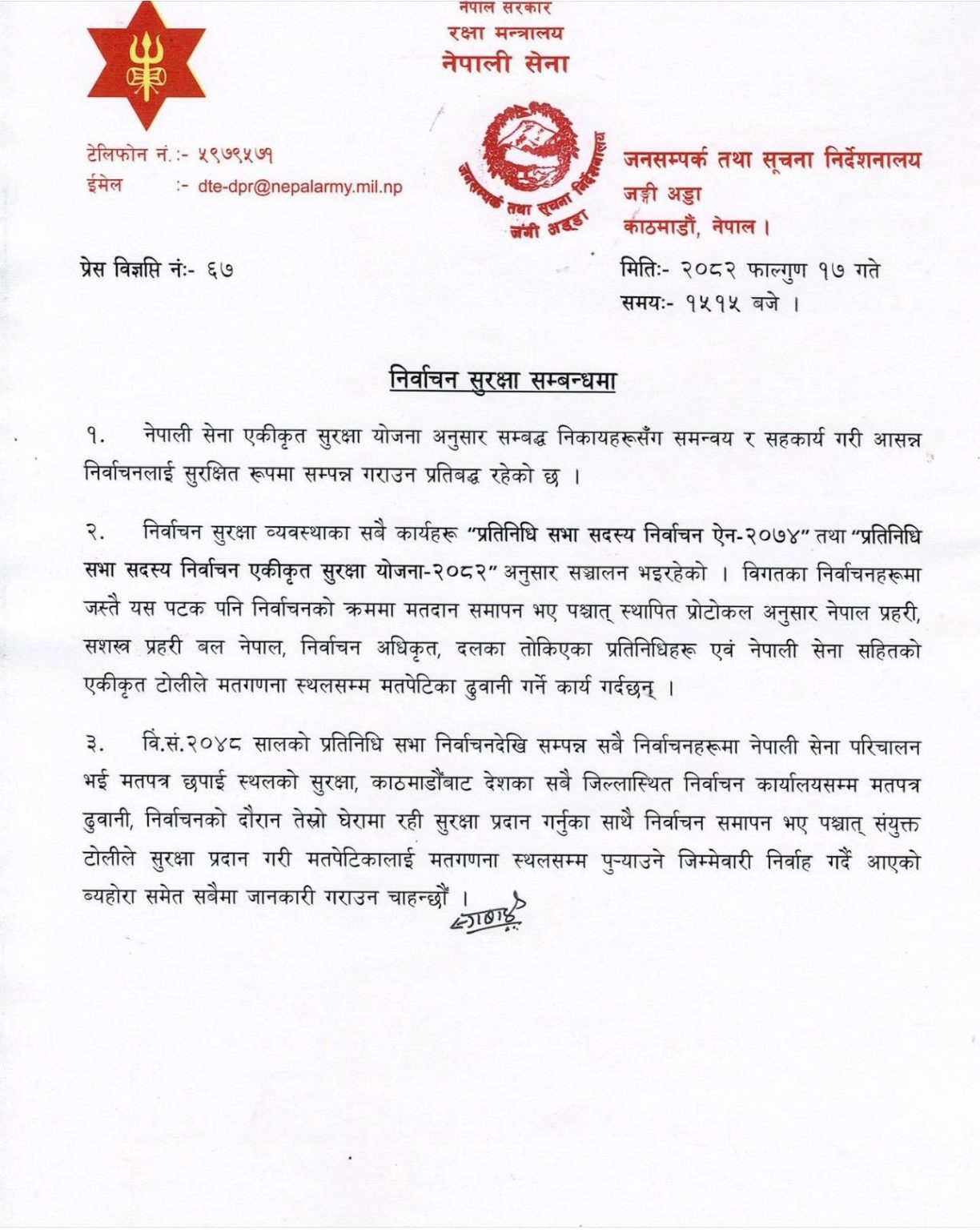 जनसम्पर्क तथा सूचना निर्देशनालयले आइतबार विज्ञप्ति जारी गर्दै नेपाली सेनाले एकीकृत सुरक्षा योजना–२०८२ अनुसार सम्बन्धित निकायहरूसँग समन्वय र सहकार्य गरी निर्वाचन सुरक्षा व्यवस्था मिलाइरहेको जनाएको छ।
