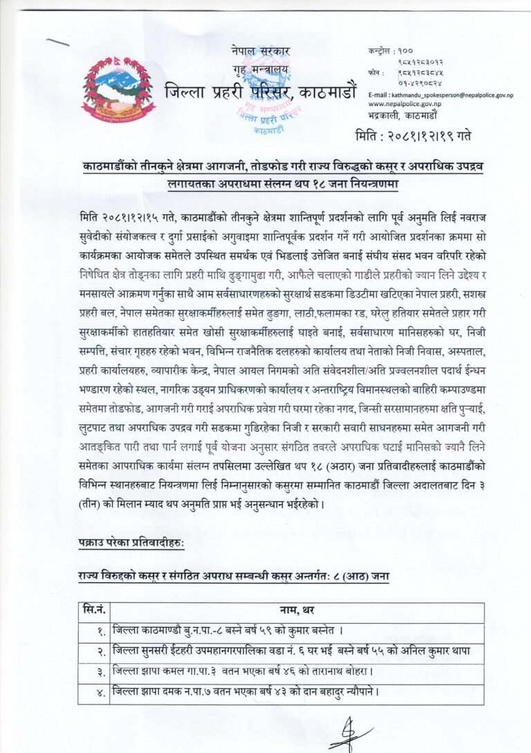 आम सर्वसाधारणको सुरक्षार्थ सडकमा डिउटीमा खटिएका नेपाल प्रहरी, सशस्त्र प्रहरी बल, नेपालका सुरक्षाकर्मीलाई ढुङगा, लाठी,फलामका रड, घरेलु हतियारले प्रहार गरेका थिए । पक्राउ परेका १८ जनालाई काठमाडौं जिल्ला अदालतबाट ३ दिनको समय लिएर अनुसन्धान गरिरहेको जनाएको छ ।