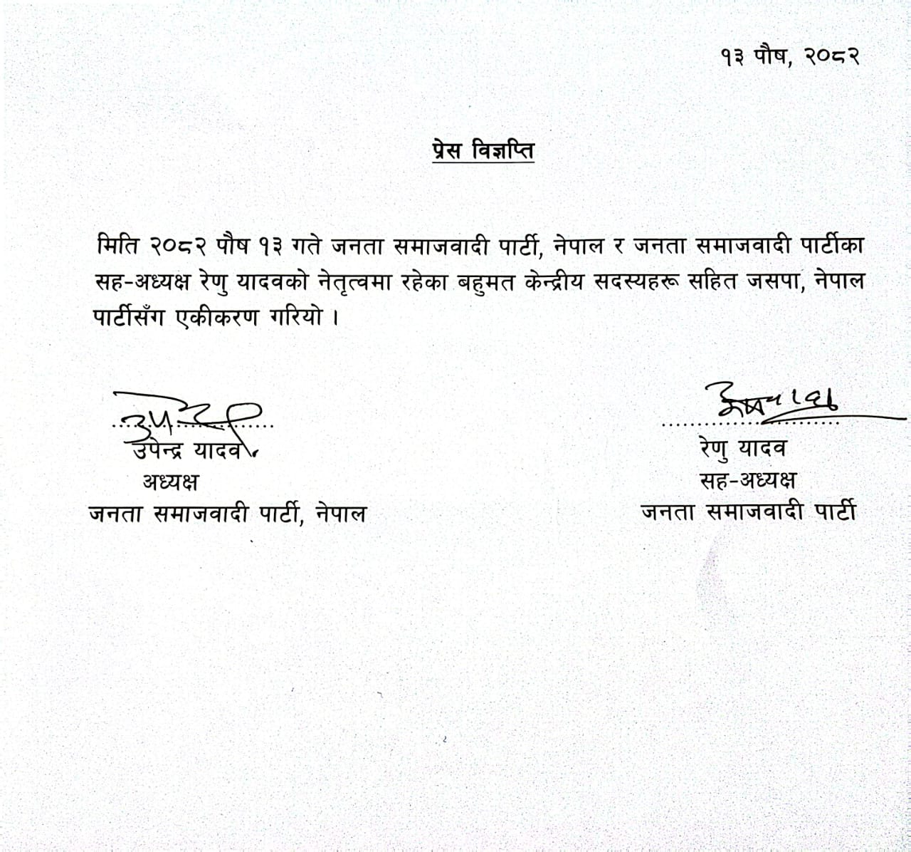 जसपा फर्किएका नेताहरू रेणु,प्रदीप लगायतलाई जसपा अध्यक्ष उपेन्द्र यादवले स्वागत गरेका छन् । अध्यक्ष उपेन्द्र यादव र रेणु यादवले संयुक्त विज्ञप्ति जारी गर्दै जसपासँग एकता गरेको जानकारी गराएका छन् ।