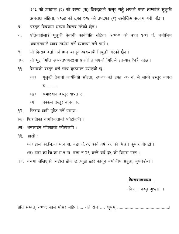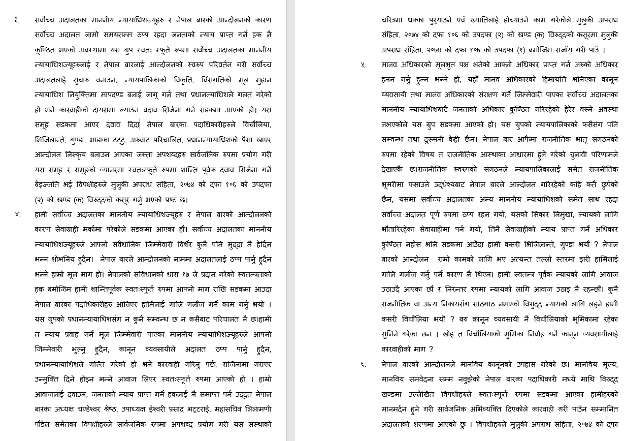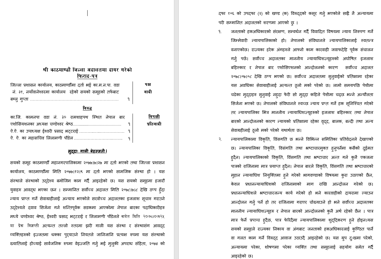 संस्थामा हजारौ युवाहरु आवद्ध रहेको समेत जानकारी गराएको छ । सर्वोच्च अदालत ठप्प हुँदा न्याय प्राप्त गर्ने सेवाग्राहीलाई अन्याय भएकोले सर्वाेच्च अदालतका इजलाश सूचारु गराउने उद्देश्यले दवाव सिर्जना गर्न शन्तिपूर्वक सडकमा आएकोमा नेपाल बारका पदाधिकारीहरु मध्ये चण्डेश्वर श्रेष्ठ, ईश्वरी प्रसाद भट्टराई र लिलामणी पौडेलले समेत प्रेस विज्ञप्ती जारीगरी अत्यन्त तल्लो स्तरमा झरी गाली यस संस्था र संस्थासंग आवद्द व्यक्तिहरुको इज्जतमा धक्का पुर्याउने नियतले जानिजानि प्रत्यक्ष रुपमा यस संस्थाको ख्यातिलाई होच्याई सार्वजनिक रुपमा वेइज्जति गरेकोले मुद्दा दायर गरीएको छ ।