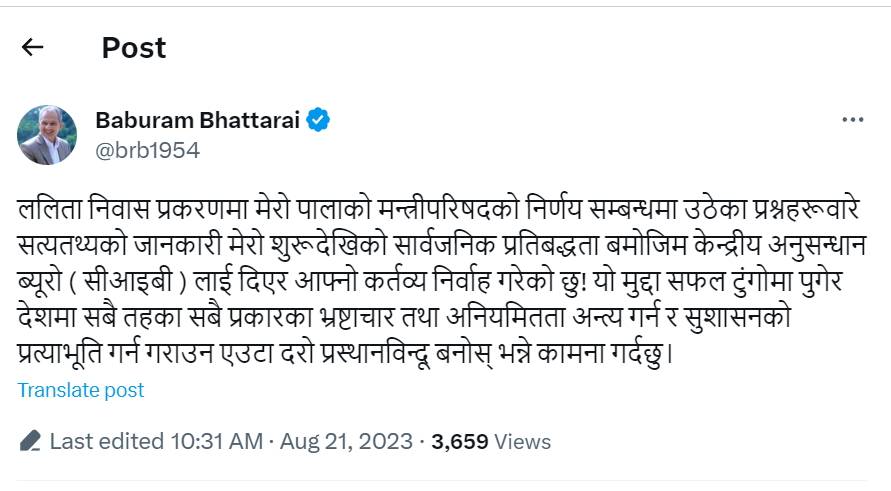 काठमाडौं । पूर्वप्रधानमन्त्री तथा नेपाल समाजवादी पार्टीका अध्यक्ष डाक्टर बाबुराम भट्टराईले ललिता निवास प्रकरणमा आफ्नो संलग्नता बारे केन्द्रीय अनुसन्धान ब्यूरो (सीआइबी) लाई जानकारी दिएका छन् ।