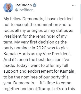 बाइडेनले पोस्टमा उपराष्ट्रपति कमला ह्यारिसलाई समर्थन गर्ने पनि घोषणा गरेका छन्। बाइडेनले भने, ‘सन् २०२० मा पार्टीको राष्ट्रपतिको उम्मेदवार बनेपछि मेरो पहिलो निर्णय कमला ह्यारिसलाई उपराष्ट्रपतिमा छान्ने थियो र यो सबैभन्दा राम्रो निर्णय थियो ।’