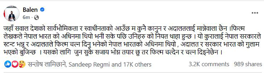 बालेनले लेखेका छन्, ‘जहाँ सवाल देशको सार्वभौमिकता र स्वाधीनताको आउँछ म कुनै कानुन र अदालतलाई मान्नेवाला छैन । फिल्म लेखकले नेपाल भारतको अधिनमा थियो भनिसकेपछि उनीहरुको नियत थाहा हुन्छ । यो कुरालाई नेपाल सरकारले स्टन्ट भन्नु र अदालतले फिल्म चल्न दिनु भनेको नेपाल भारतको अधिनमा थियो, अदालत र सरकार भारत को गुलाम भएको बुझिन्छ । यसको लागि जुनसुकै सजाय भोग्न तयार छु तर फिल्म चल्दैन र चल्न दिइनेछैन ।’