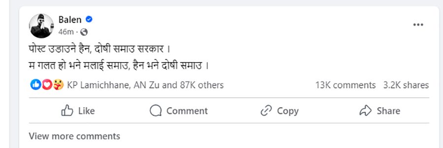 बालेनले यसअघि सोमबार नेकपा एमालेकी सांसद रेखा शर्माले एक जना बालिकालाई बन्धक बनाइ घरेलु हिंसा गरेको भन्दै तस्बिरसहित फेसबुकमा पोष्ट गरेका थिए । उक्त पोष्ट हाल डिलिट गरिएको छ । पोष्ट डिलिटबारे उनको सचिवालयले अत्यधिक रिपोर्टका कारण फेसबुकले कम्युनिटी गाइडलाइन्स देखाएर रिमुभ गरेको बताएको थियो । तर, बेलुका बालेनले सरकारले नै सो पोष्ट डिलिट गरेको आरोपसहितको स्टाटस लेखेका हुन् ।