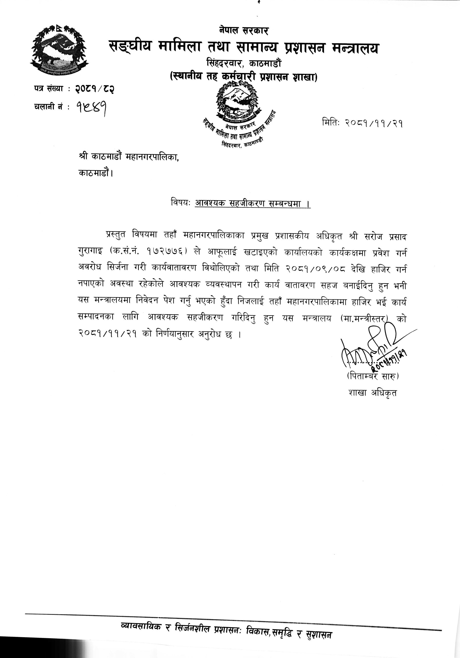 मन्त्रालयबाट प्रमुख प्रशासकीय अधिकृतका रूपमा काठमाडौं महानगरपालिकामा खटाइएका कर्मचारी सरोज प्रसाद गुरागाईंलाई महानगर प्रमुख बालेन्द्र साह ‘बालेन’ले हाजिर गर्न नदिएको गुनासो आएपछि मन्त्रालयले कर्मचारीलाई काम गर्ने वातावरण बनाइदिन महानगरलाई आग्रह गरेको हो ।