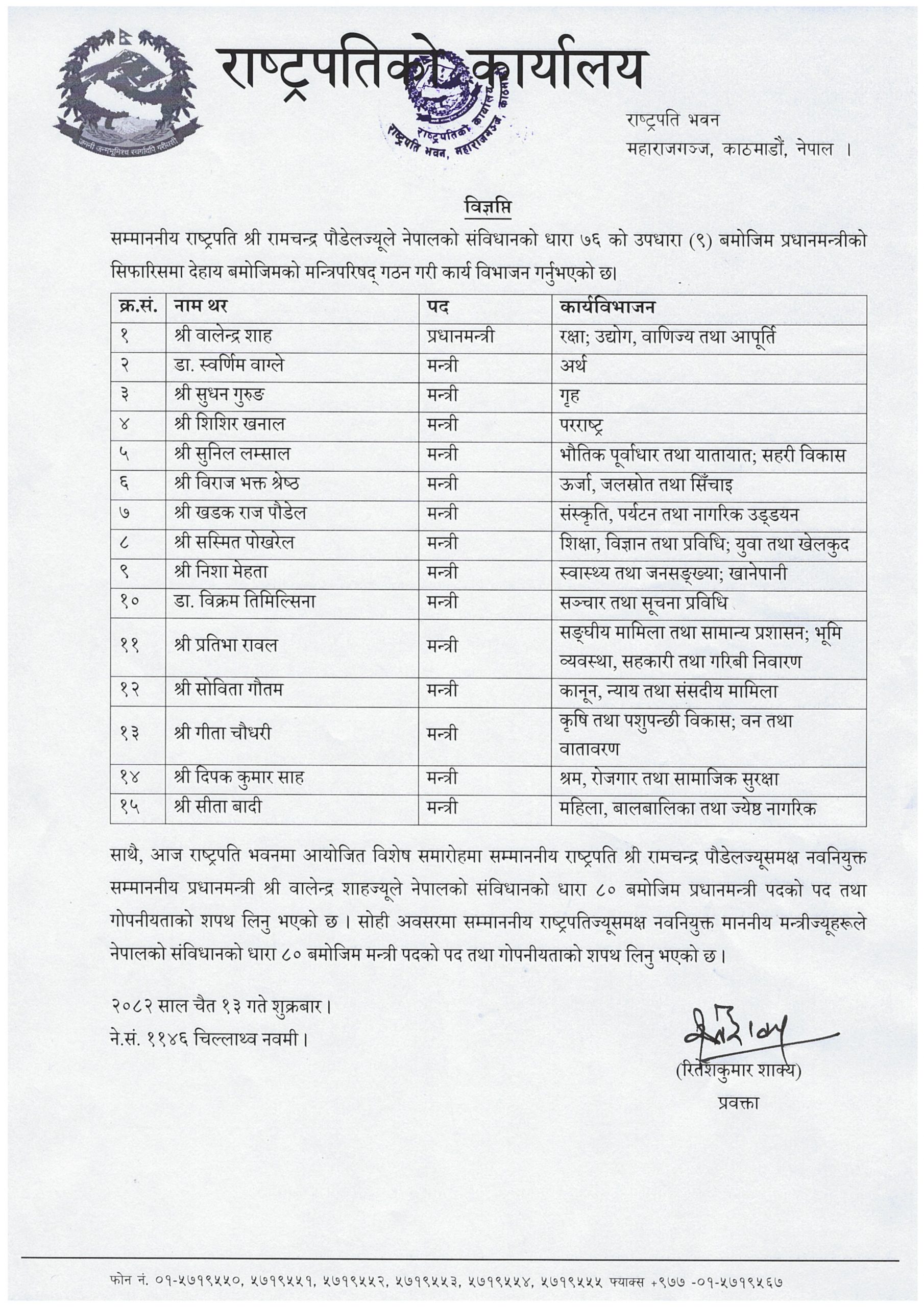 काठमाडौँ । राष्ट्रपति रामचन्द्र पौडेलले संविधानको धारा ७६ को उपधारा ९ बमोजिम प्रधानमन्त्री बालेन शाहको सिफारिसमा १५ सदस्यीय मन्त्रिपरिषद् गठन गरेर कार्यविभाजन गरेका छन् ।