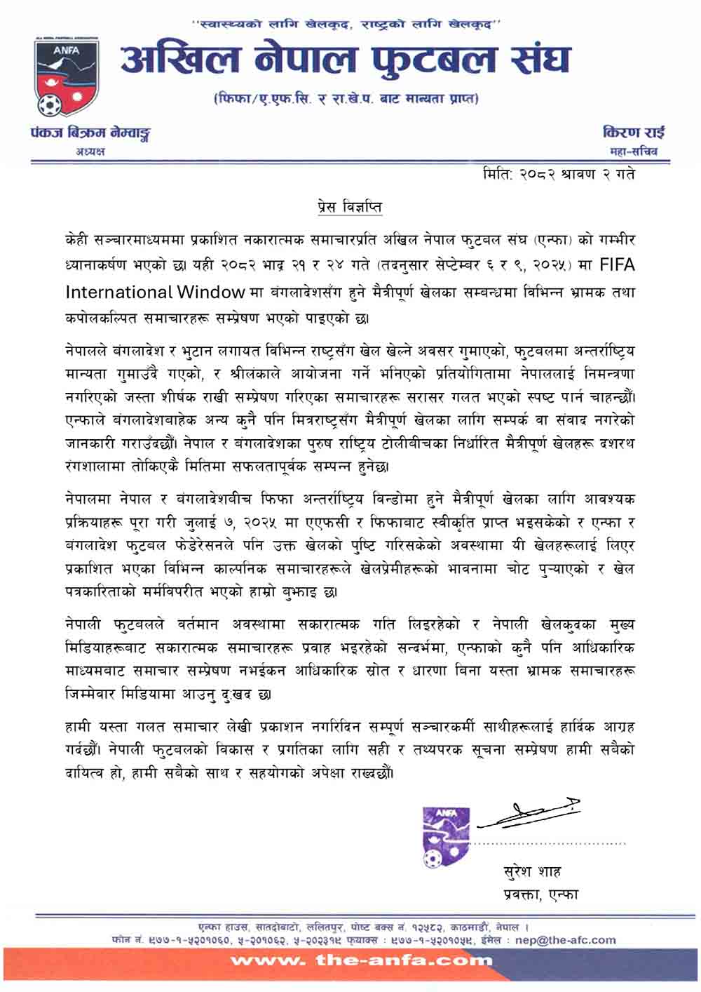 शुक्रबार एक विज्ञप्ति जारी गर्दै एन्फाका प्रवक्ता सुरेन्द्र शाहले विभिन्न सञ्चारमाध्यममा आएका कपोकल्पित र भ्रामक समाचारको खण्डन गर्दै, आगामी सेप्टेम्बर ६ र ९ मा दशरथ रंगशालामै खेलहरू हुने बताएका हुन् ।