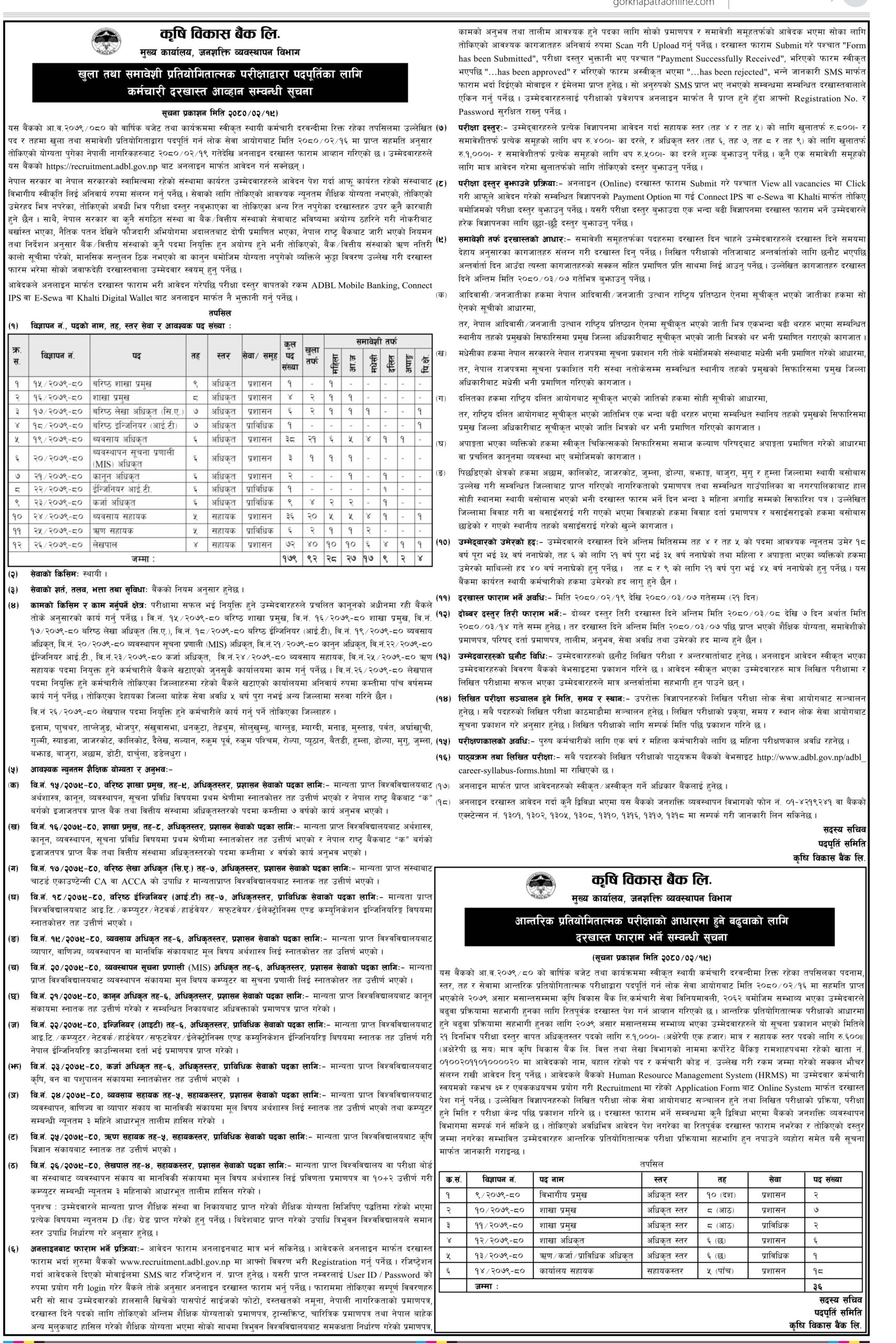 काठमाडौँ । कृषि विकास बैंकले नयाँ कर्मचारी नियुक्तिका लागि दरखास्त आह्वान गरेको छ ।