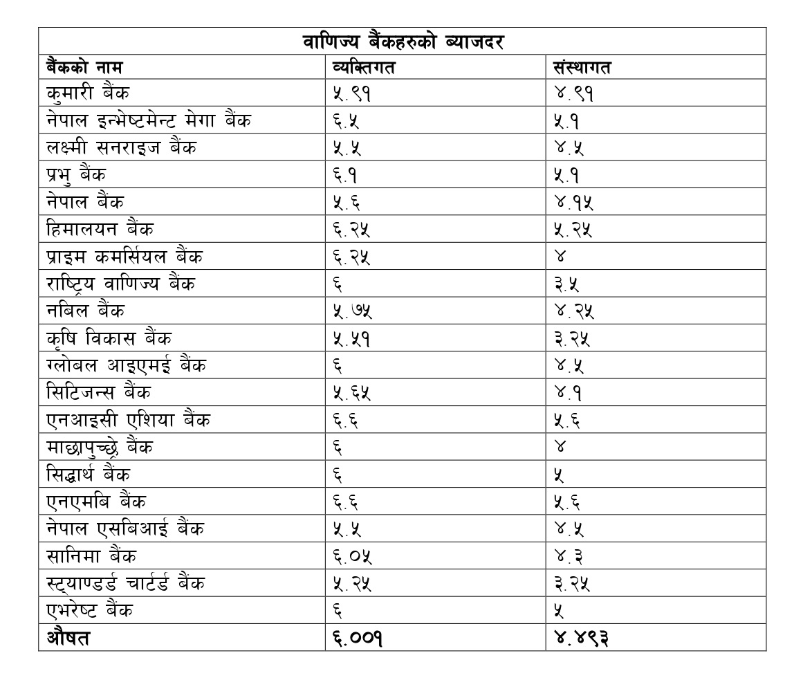 फागुन महिनाका लागि समग्र वाणिज्य बैंकहरुको ब्याजदर औसतमा ६.००१ प्रतिशत रहने भएको छ ।