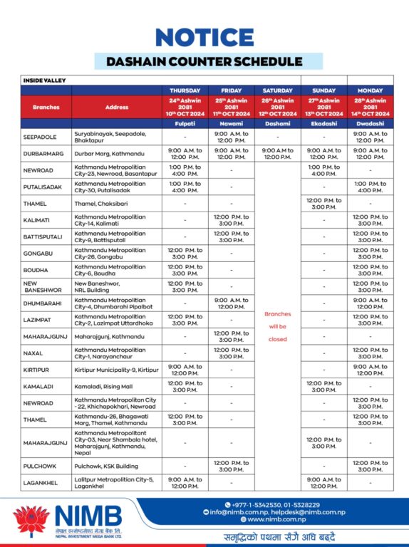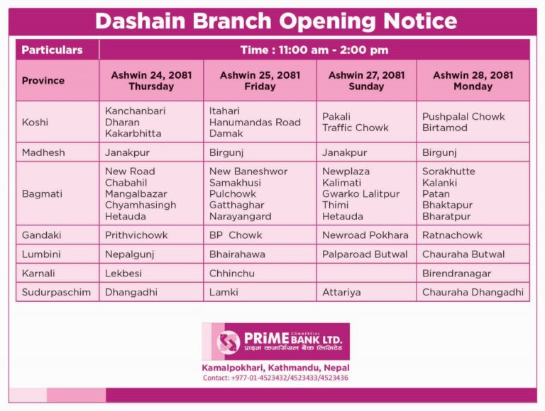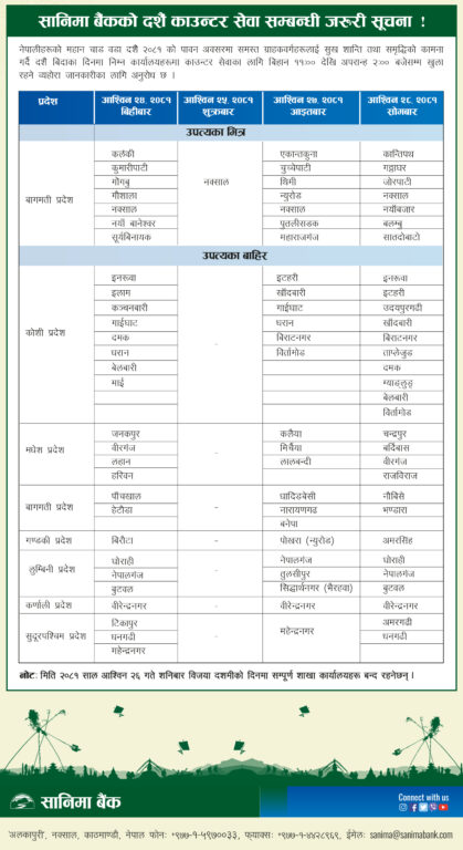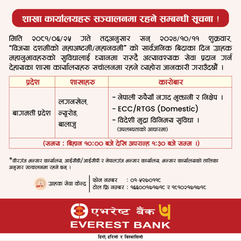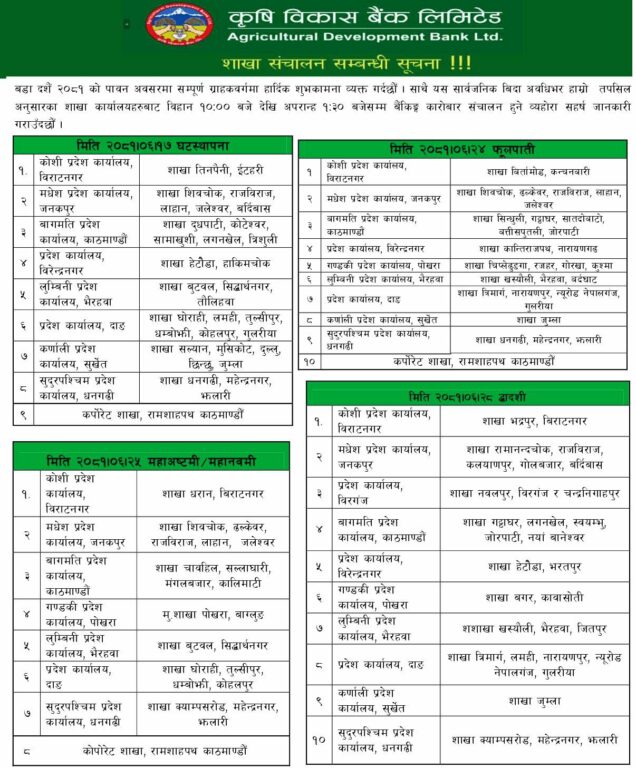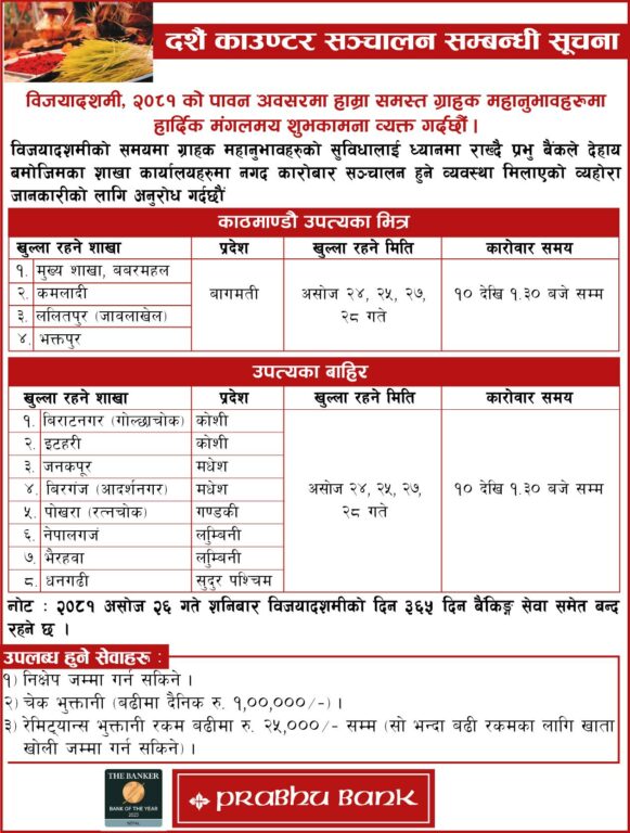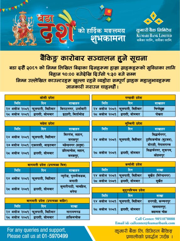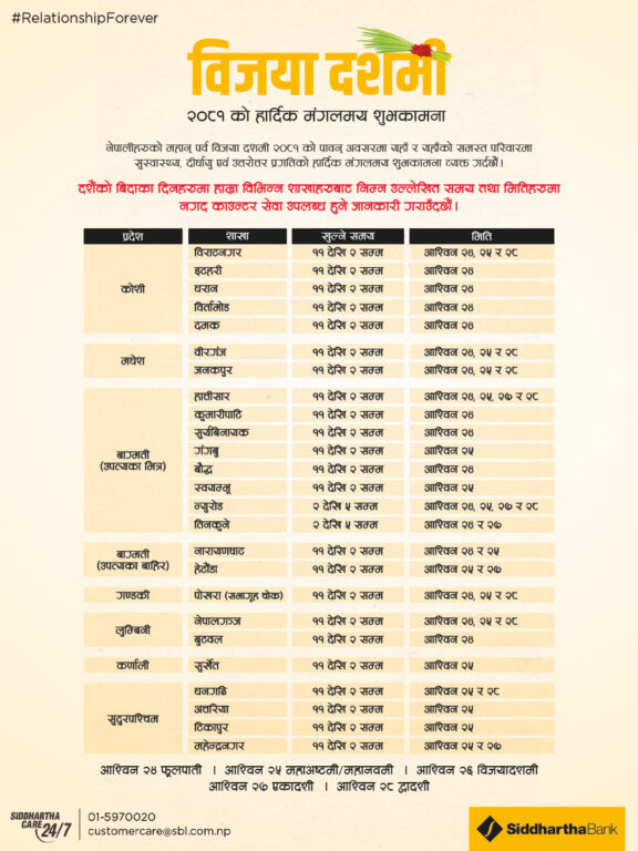 दसैंको समयमा सबै तिर विदा हुने गरेको छ । तर, बैंकहरुले भने दसैंको टिकाको दिन पनि शाखा खोलेर सेवा दिनेछन् ।