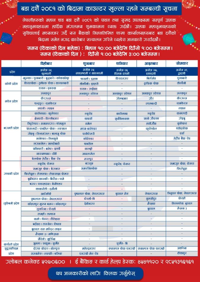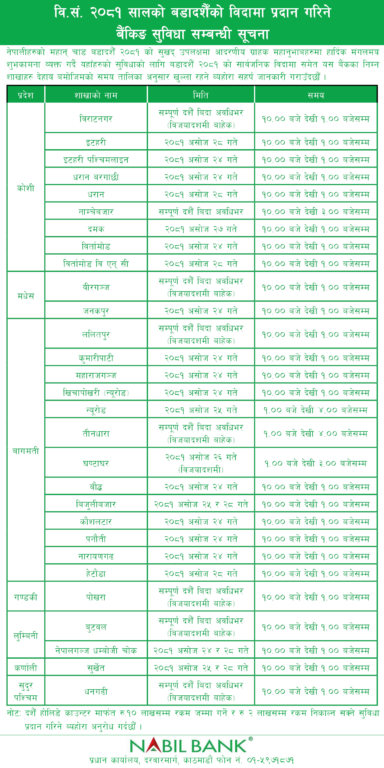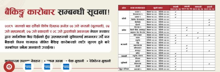 काठमाडौं । दसैं टिकाको दिन आज बैंकहरुले आफ्ना केही शाखा खोलेर सेवा दिइरहेका छन् । बैंकहरुले आजका साथै असोज २८ गते सोमबारसम्म बैंकका सबै शाखा नखुले पनि प्रदेश अनुसार केही शाखा खोलेर सेवा दिइरहेका छन् ।