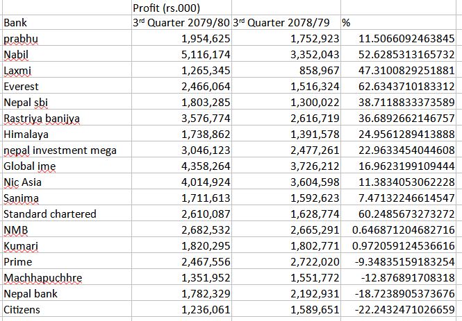 सञ्चालनमा रहेका २१ वटा वाणिज्य बैंकमा १४ वटाको नाफा बढेको छ भने ७ वटाको घटेको छ । चैत मसान्तसम्मको वित्तीय अवस्था सार्वजनिक गर्दा नाफा बढाउने बैंकमा प्रभु, नबिल, लक्ष्मी, एभरेष्ट, नेपाल एसबिआई, राष्ट्रिय वाणिज्य। हिमालयन, नेपाल इन्भेष्टमेन्ट मेगा, ग्लोबल आइएमई, एनआईसी एशिया, सानिमा, स्टयान्डर्ड चार्टर्ड, एनएमबि र कुमारी बैंक रहेका छन् । एनएमबि र कुमारी बैंकको नाफा भने १ प्रतिशतभन्दा कम बढेको छ ।