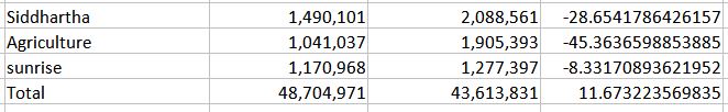 प्राइम बैंकको नाफा ९.३४ प्रतिशत, माछापुच्छ्रे बैंकको नाफा १२.८७, नेपाल बैंकको १८.७२ प्रतिशत, सिटिजन्स बैंकको नाफा २२.२४ प्रतिशत, सिद्धार्थ बैंकको नाफा २८.६५ प्रतिशत, कृषि विकास बैंकको नाफा ४५.३६ प्रतिशत र सनराइज बैंकको नाफा ८.३३ प्रतिशतले घटेको छ ।