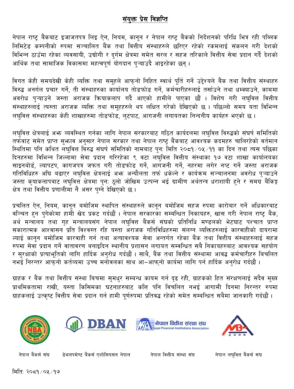नेपाल बैंकर्स संघ, डेभलपमेन्ट बैंकर्स एसोसिएशन नेपाल, नेपाल वित्तीय संस्था संघ र नेपाल लघुवित्त बैंकर्स संघले संयुक्त विज्ञप्ति जारी गरी विगत केही समयदेखि केही व्यक्ति तथा समूहले आफ्नो निहीत स्वार्थ पूर्ति गर्ने उद्देश्यले बैंक तथा वित्तीय संस्थाहरूविरुद्ध अनर्गल प्रचार गर्ने, ती संस्थाहरूका कार्यालय तोडफोड गर्ने, कर्मचारीहरूलाई तर्साउने तथा धम्क्याउने, काममा अवरोध पुर्याउने जस्ता अराजक क्रियाकलाप गरी आतंक सृजना गरेको भन्दै तिनीहरूलाई कारबाही गर्न माग गरेको हो ।