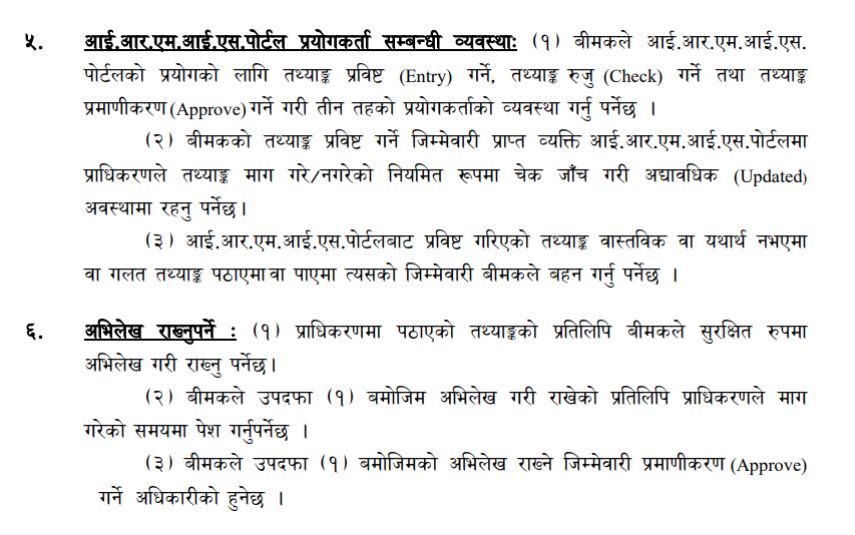 प्राधिकरणले आईआरएमआईएस सम्बन्धी मार्गदर्शन–२०८० जारी गर्दै बिमा तथा पुनर्बिमा कम्पनीलाई सो पोर्टलमा अनिवार्य जोडिनुपर्ने व्यवस्था गरेको हो ।