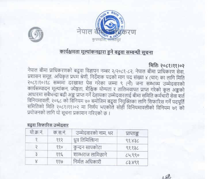 बीमा समिति कर्मचारी सेवा सर्त विनियमावली, २०६८ को विनियम ७० बमोजिम बढुवा नियुक्तिका लागि सिफारिस गरिएको समितिले जनाएको छ ।