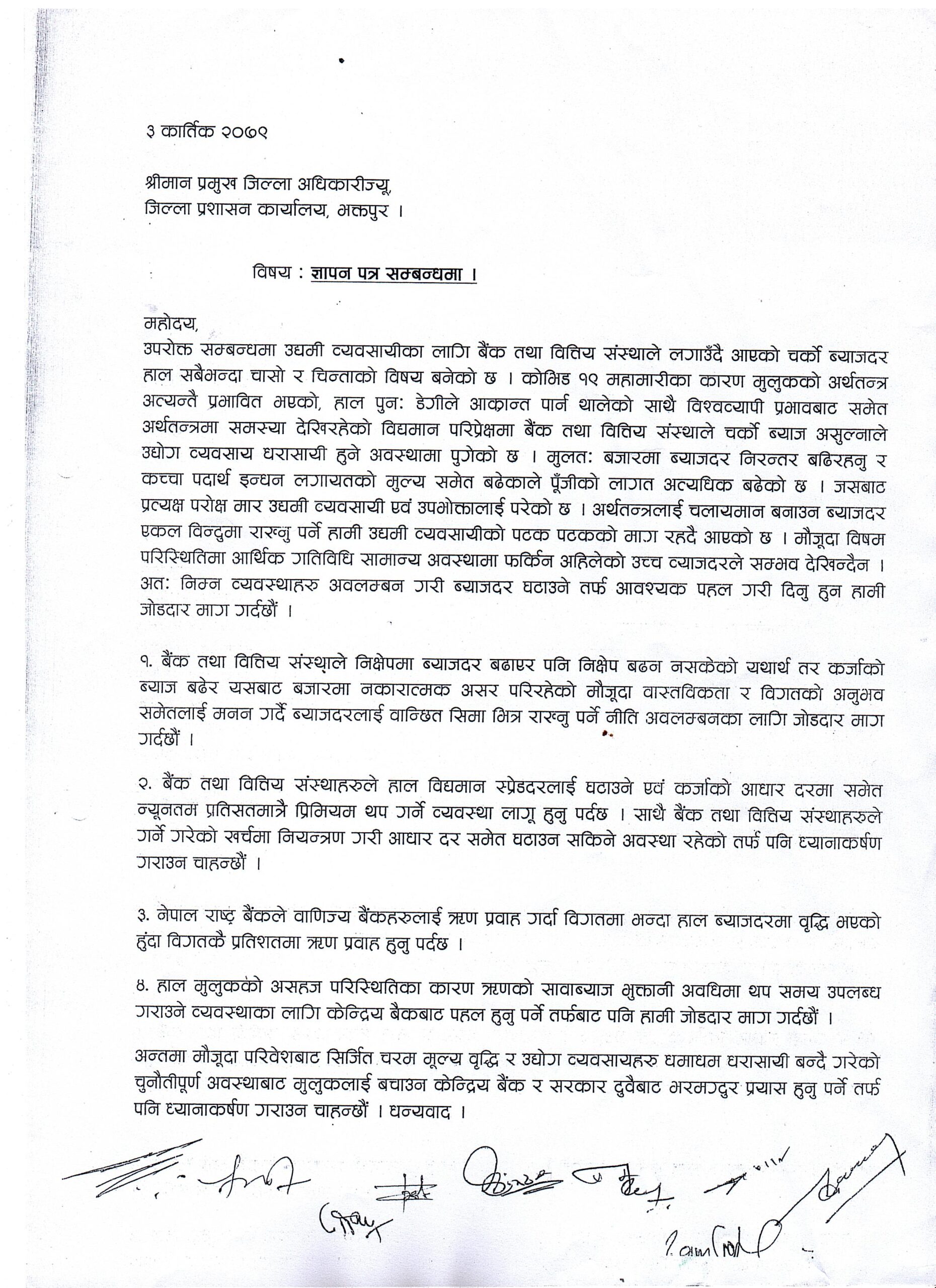 प्रमुख जिल्ला अधिकारी रुद्रादेवी शर्मालाई ज्ञापन पत्र पेश गर्दै भक्तपुर चेम्बर अफ कमर्सका उपाध्यक्ष कविदास श्रेष्ठले चर्को ब्याजदरले उद्योग व्यवसाय नै बन्द गर्नुपर्ने अवस्था सिर्जना भएको बताए ।