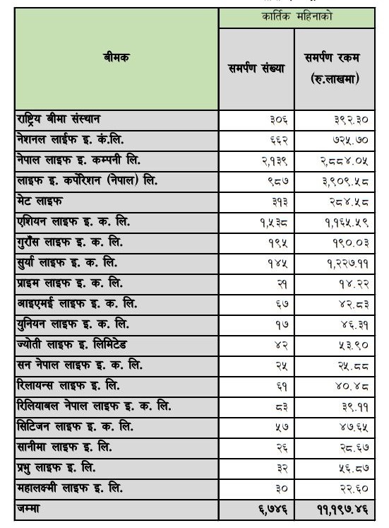 कात्तिकमा मात्रै ११ करोड ९७ लाख ४६ हजार रुपैयाँको पोलिसी सरेण्डर भएको बीमा प्राधिकरणले सार्वजनिक गरेको तथ्याकमा उल्लेख छ ।