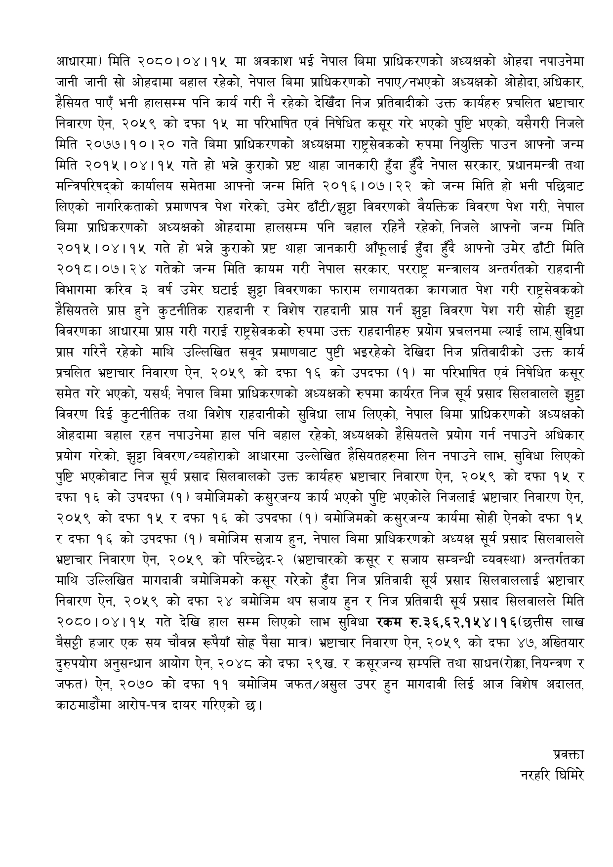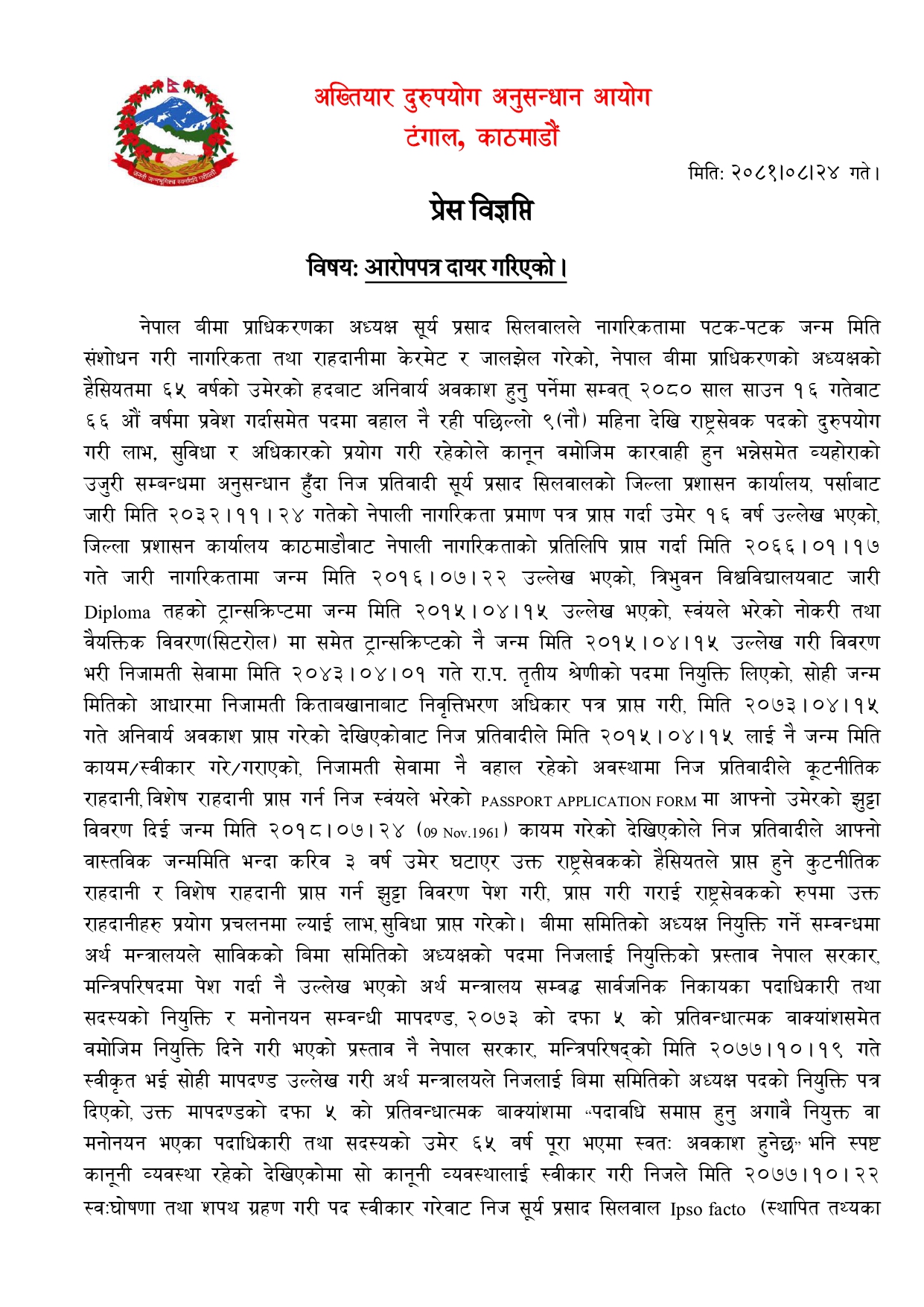 काठमाडाैँ । अख्तियार दुरुपयोग अनुसन्धान आयोगले नेपाल बीमा प्राधिकरणका अध्यक्ष सूर्य प्रसाद सिलवालविरुद्ध मुद्दा दायर गरेको छ । आयोगले सोमबार विशेष अदालत काठमाडौंमा सिलवालविरुद्ध आरोपपत्र दायर गरेको हो । सिलवालले नागरिकतामा पटक(पटक जन्म मिति संशोधन गरी नागरिकता तथा राहदानीमा केरमेट र जालझेल गरेको आरोपपत्रमा उल्लेख छ ।