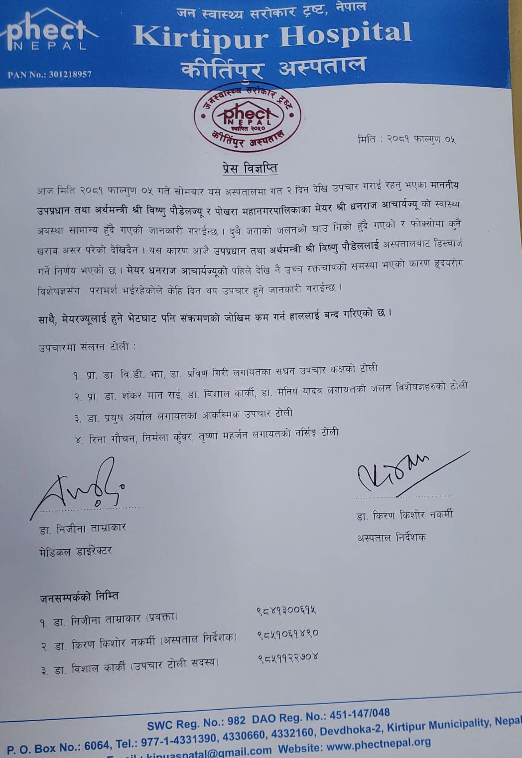 ‘दुवै जनाको जलनको घाउ निको हुँदै गएको र फोक्सोमा कुनै खराब असर परेको देखिँदैन । यस कारण आजै उपप्रधान तथा अर्थमन्त्री विष्णु पौडेललाई अस्पतालबाट ‘डिस्चार्ज’ गर्ने निर्णय भएको छ,’ कीर्तिपुर अस्पतालद्वारा जारी प्रेस विज्ञप्तिमा भनिएको छ, ‘मेयर धनराज आचार्यको पहिलेदेखि नै उच्च रक्तचापको समस्या भएको कारण हृदयरोग विशेषज्ञसँग परामर्श भईरहेकाले केही दिन थप उपचार हुने जानकारी गराइन्छ ।’