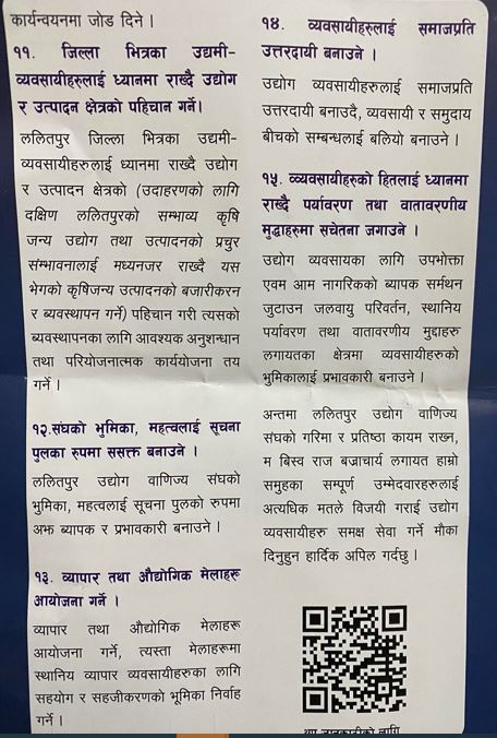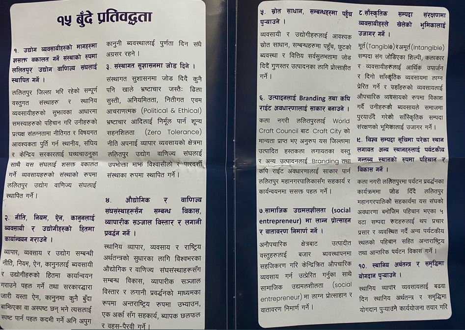 काठमाडौ । ललितपुर उद्योग वाणिज्य संघको अध्यक्षका आकांक्षी विश्वराज बज्राचार्यले घोषणापत्र सहित १५ बुदे प्रतिबद्धता सार्वजनिक गरेका छन् । मंगलबार आयोजित कार्यक्रममा उनले आफ्नो प्रतिबद्धता पत्र सार्वजनिक गरेका हुन् ।