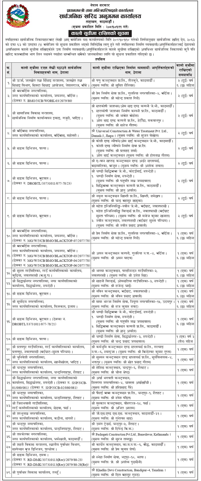यस्तै कोशी एण्ड न्यौपाने ओम साई कन्स्ट्रक्सन जे.भीलाई २ वर्ष , ए वान खप्तड कन्स्ट्रक्सन एण्ड अर्डर सप्लायर्सलाई २ वर्ष, चण्डी सिद्धिबाबा जे.भीलाई २ वर्ष, नमुना कन्स्ट्रक्सन खिम्ती प्रा. लिलाई २ वर्ष, नवीन कन्स्ट्रक्सनलाई १ वर्ष ६ महिनाको लागि कालो सूचीमा राखिएको छ ।