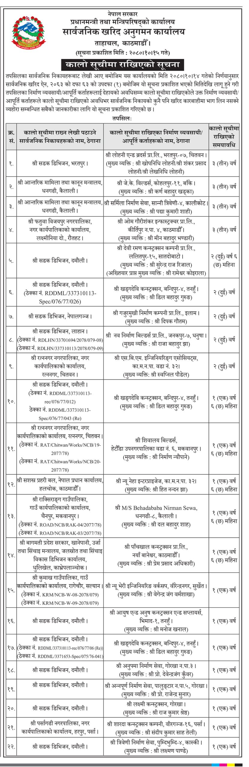 यसैगरी दीपक गौतम मुख्य व्यक्ति भएको गजुरमुखी निर्माण कम्पनी, इलाम, राजाबहादुर झा मुख्य व्यक्ति भएको नव निर्माण बिल्डर्स प्रालि, जनकपुर, स्वप्निल पौडेल मुख्य व्यक्ति भएको एस.बि.एम. इन्जिनियरिङ एसोसियट्स, काठमाडौं दुई वर्षका लागि कालोसूचीमा परेका छन् ।