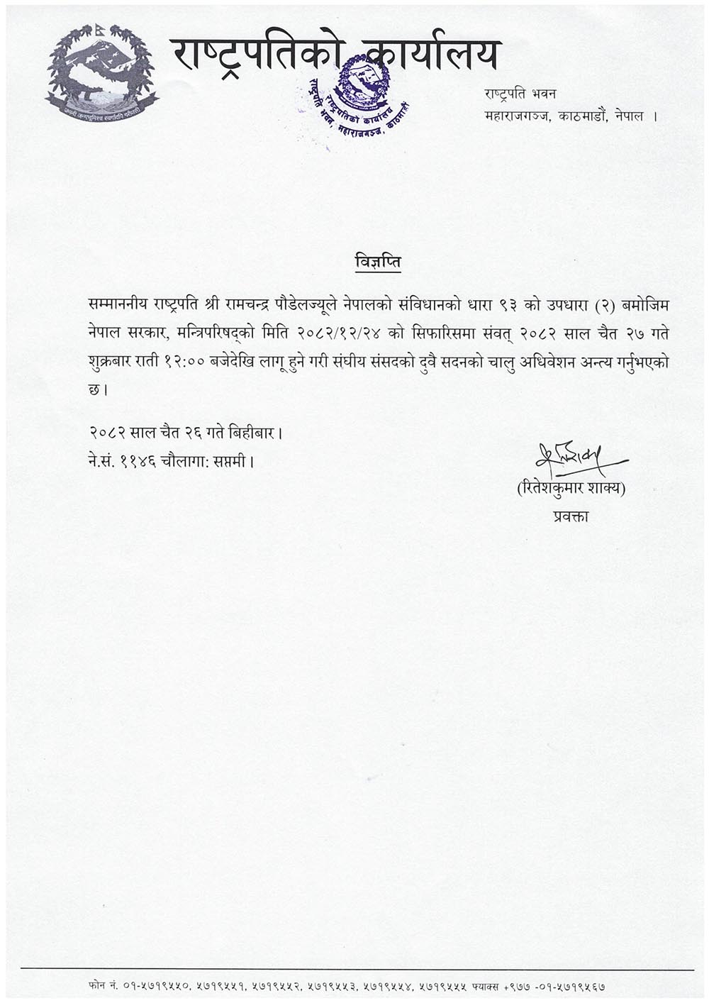 काठमाडौं । संघीय संसदको चालु अधिवेशन अन्त्य भएको छ । राष्ट्रपति रामचन्द्र पौडेलले नेपालको संविधानको धारा ९३ को उपधारा (२) बमोजिम सरकारको सिफारिशमा चैत २७ गते शुक्रबार राती १२ बजेदेखि लागू हुने गरी संघीय संसदको दुवै सदनको चालु अधिवेशन अन्त्य गरेका हुन् ।