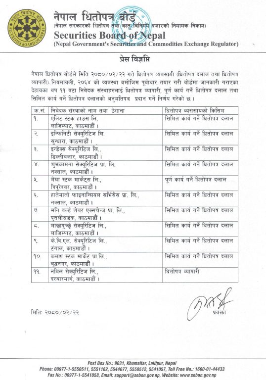 काठमाडौं । नेपाल धितोपत्र बोर्डले थप ११ वटा कम्पनिलाई ब्रोकर लाइसेन्स दिएको छ ।