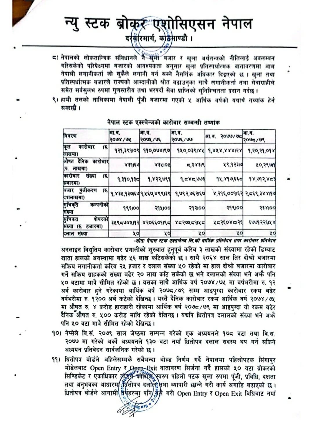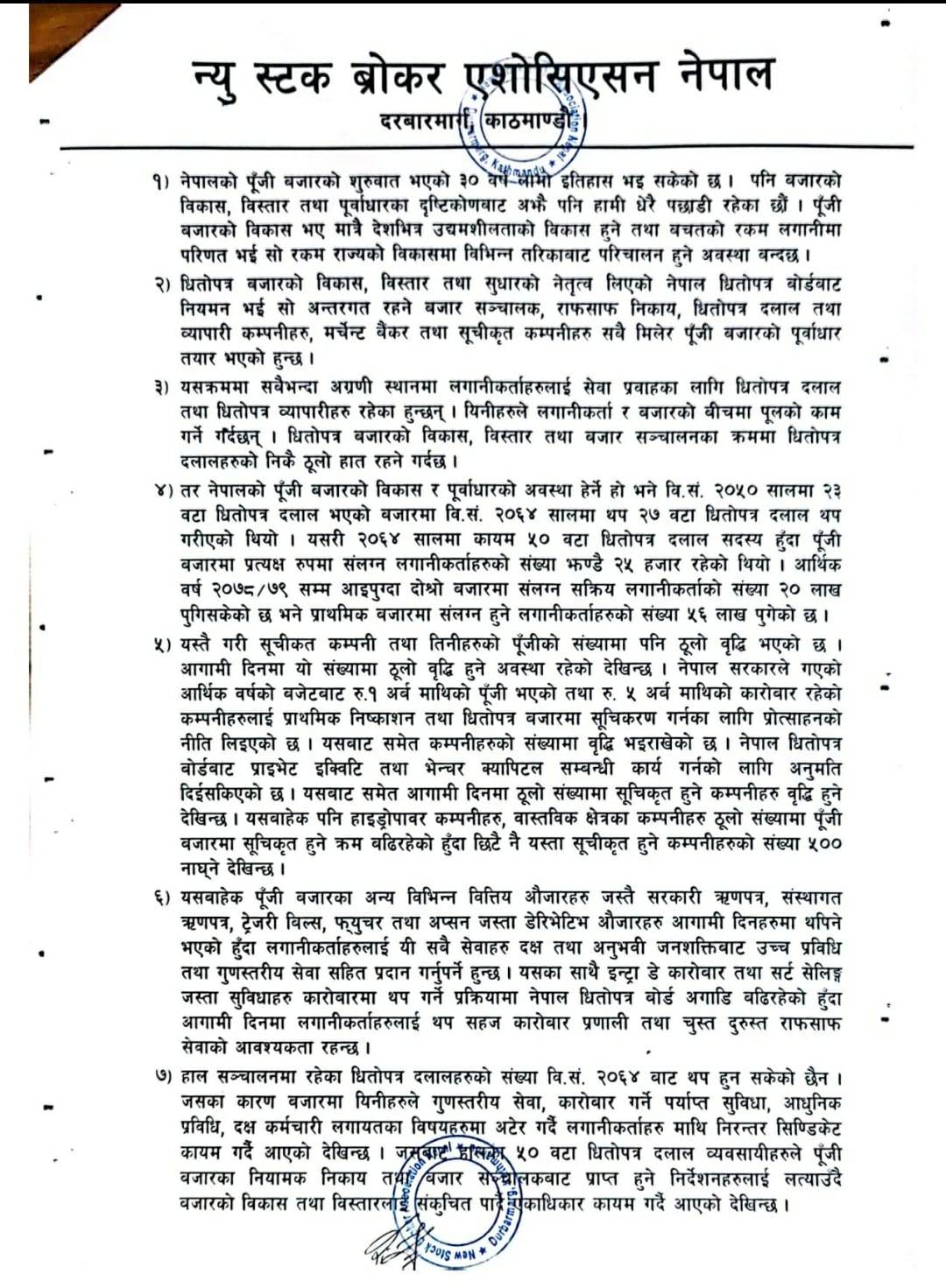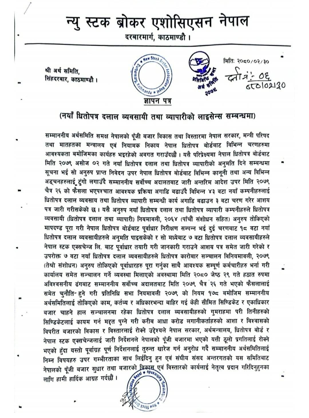 यसै अनुरुप नयाँ धितोपत्र दलाल तथा धितोपत्र व्यापारी कम्पनीहरुले धितोपत्रव्यवसायी (धितोपत्र दलाल तथा व्यापारी) नियमावली, २०६४ ( पाँचौं संशोधन सहित) अनुरुप तोकिएकोमापदण्ड पूरा गरी नेपाल धितोपत्र बोर्डबाट पूर्वाधार निरीक्षण सम्पन्न भई दुई चरणबाट १८ वटा नयाँ धितोपत्र दलाल व्यवसायीहरुले अनुमति पाइसकेको र सो मध्येबाट ७ वटा धितोपत्र दलाल व्यवसायीहरुले नेपाल स्टक एक्सचेन्ज लि। बाट पूर्वाधार तयारी गरी जानकारी गराउने आशय पत्र समेत जारी गरेको र उपरोक्त ७ वटा नयाँ धितोपत्र दलाल व्यवसायीहरुले धितोपत्र कारोबार सञ्चालन विनियमावली, २०७९ (तेश्रो संशोधन) अनुरुप तोकिएको पूर्वाधारहरु पूरा गर्नुका साथै आवश्यक सम्पूणर् कर्मचारीहरु भर्ना गरी कार्यालय समेत सञ्चालन गर्ने व्यवस्था समेत मिलाएको एशोसिएसनले जनाएको छ ।