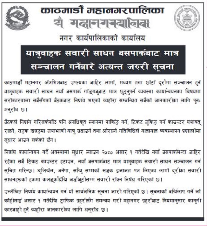 महानगरले आज सार्वजनिक सूचना निकालेर असार १ गतेदेखि नयाँ बसपार्कबाहिरका सबै टिकट काउन्टर हटाउन र नयाँ बसपार्कबाट मात्र यात्रुवाहक गाडी सञ्चालन गर्न आग्रह गरेको छ । सूचनाको बेवास्ता गरे ट्राफिक प्रहरीसँग समन्वय गरी कानुनी कारबाही गरिने महानगरपालिकाले चेतावनी दिएको छ ।