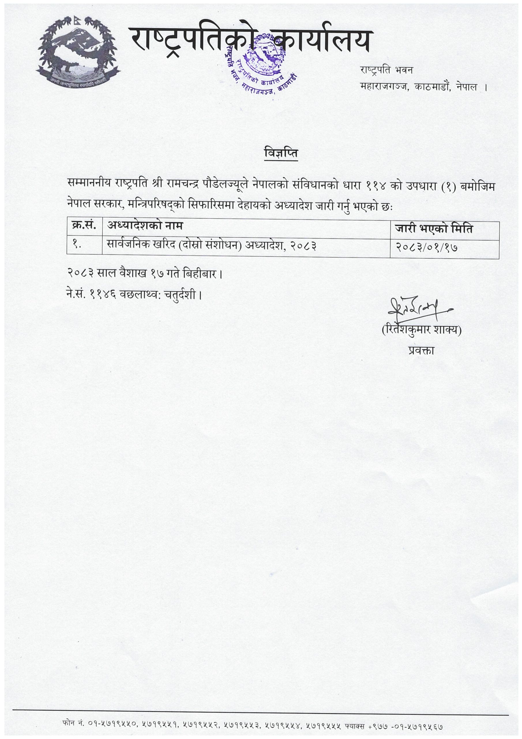 काठमाडौं । राष्ट्रपति रामचन्द्र पौडेलले अर्को अध्यादेश जारी गरेका छन्। राष्ट्रपतिले बिहीबार राति सार्वजनिक खरिद (दोस्रो संशोधन) अध्यादेश २०८३ जारी गरेका हुन्।