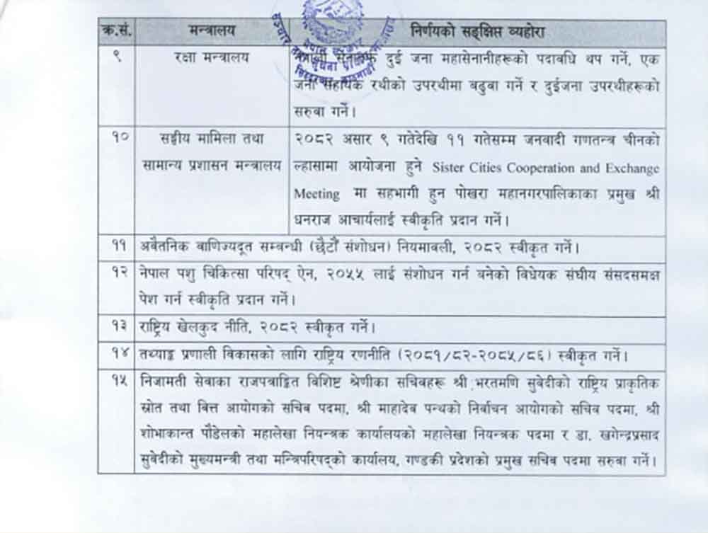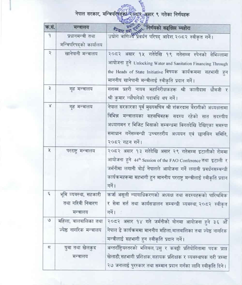काठमाडौं । असार ९ गते बसेको मन्त्रिपरिषदको बैठकका निर्णय सार्वजनिक गरिएको छ ।
