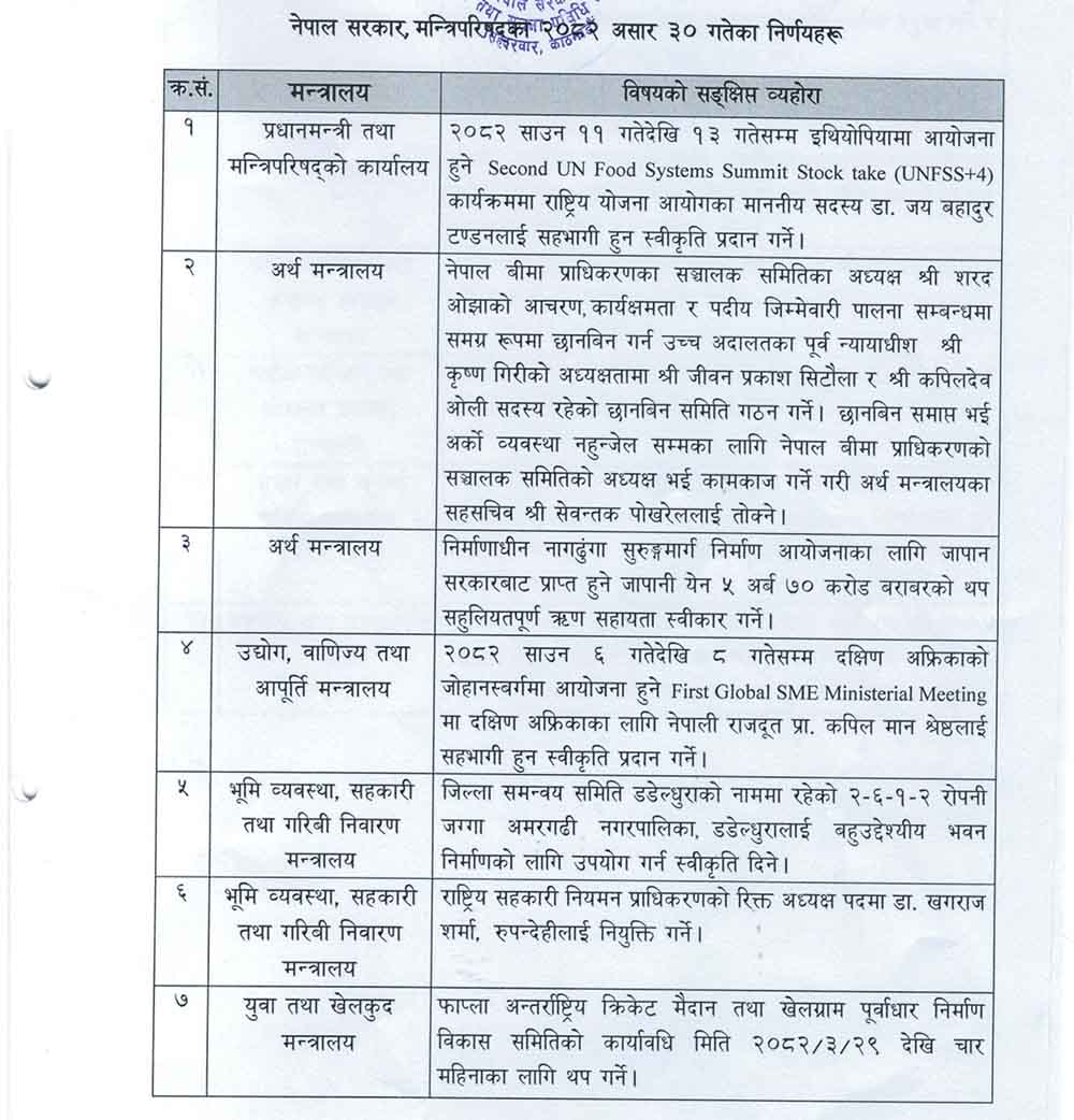 असार ३० गतेको मन्त्रिपरिषद बैठकका निर्णयहरू–