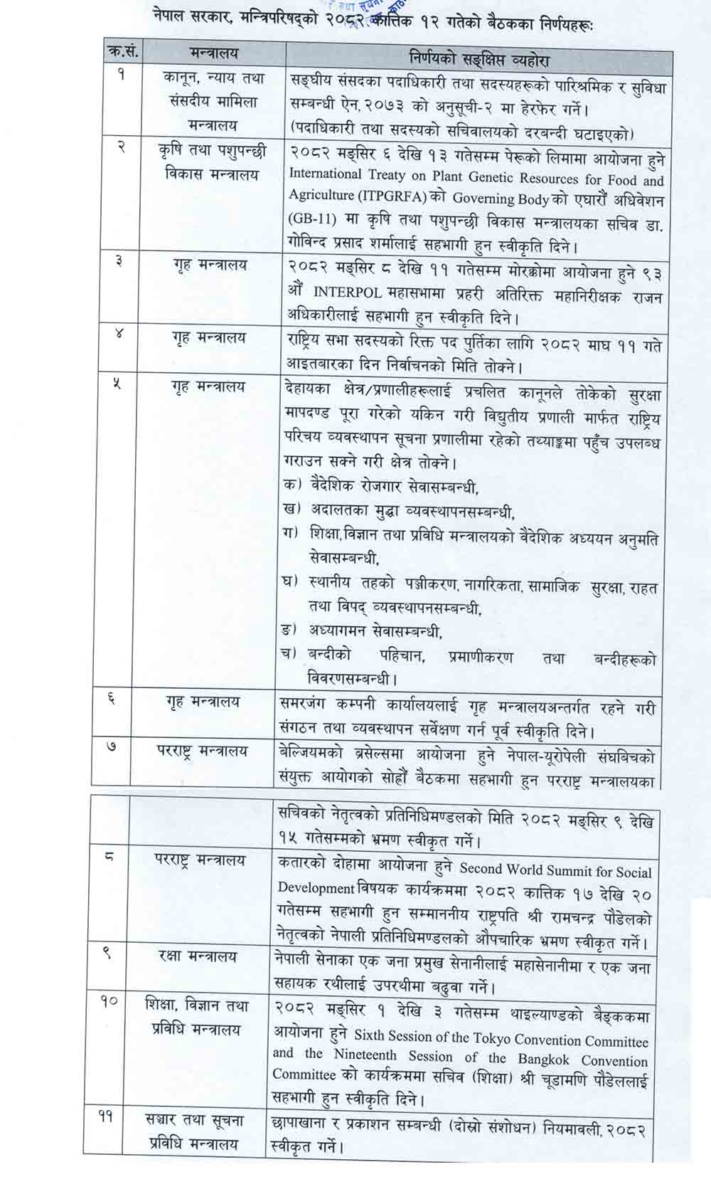 काठमाडौं । कात्तिक १२ गते बुधबार बसेको मन्त्रिपरिषद्को बैठकका निर्णयहरू सार्वजनिक गरिएको छ ।